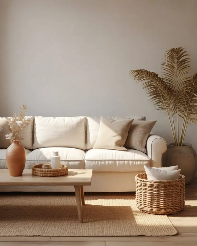 Think linen curtains, a chunky wool throw, and a jute rug layered over light oak floors. The magic is in mixing organic materials that bring warmth and dimension to an otherwise simple palette. Earthy shades like terracotta, sand, and clay can appear in pillow covers or a ceramic vase, subtly grounding the room without adding visual noise.