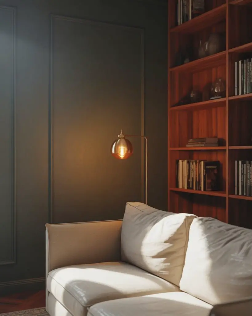 Who says neutral has to be light? Moody charcoal or slate gray walls create a sophisticated backdrop that makes lighter furniture pop. Pair with a cream sofa, warm wood shelving, and brass lighting for a look that feels cosy and enveloping, especially in evening hours. This works beautifully in homes with good natural light during the day.