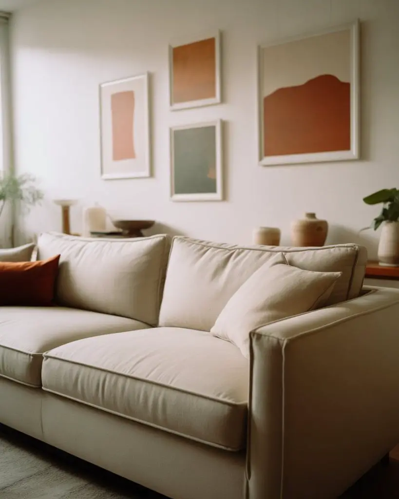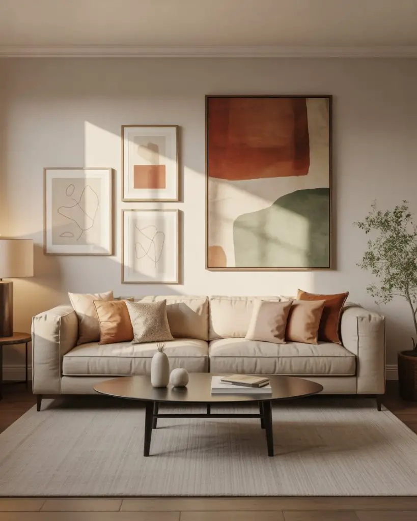 If you’re hesitant to commit to colored furniture, let your walls do the talking. A single large-scale painting or a gallery wall introduces colors and personality without altering the neutral foundation. Think abstract prints in rust, sage, or navy that echo the room’s undertones. This is a favorite among Pinterest users looking for inspiration that feels curated but not overdone.