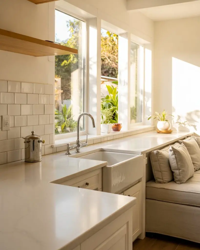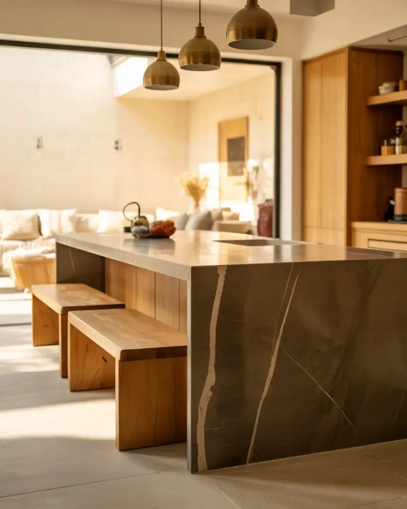 Budget-conscious homeowners often use prefab cabinets with a custom-cut stone or quartz top, saving thousands while still achieving a high-end look. If you’re working with a contractor, ask about remnant slabs—they’re perfect for island projects and often available at half the price of full sheets. The bench seating can be as simple as a padded plywood base with washable cushions, making it easy to refresh the look seasonally without a full remodel.