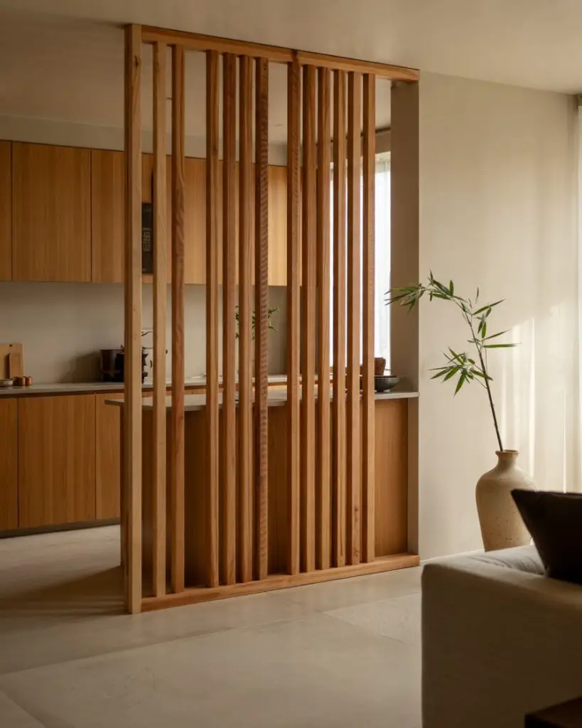 Wooden slat walls or freestanding dividers add texture and gentle separation without closing off the space—ideal for semi-open layouts where you want a hint of privacy between cooking and lounging areas. These work beautifully in modern, Japandi, and even coastal-inspired homes, and they’re easy to DIY with dimensional lumber and a few brackets. Paint them to match your trim or leave them natural for a warmer, organic feel.