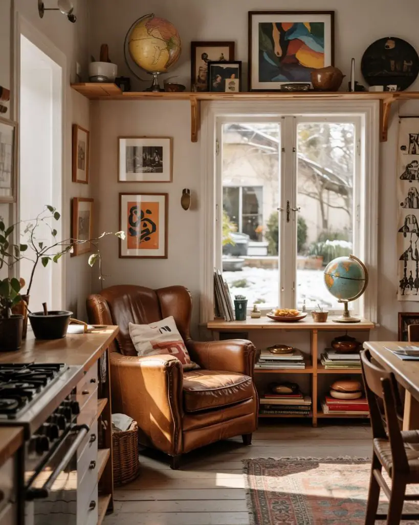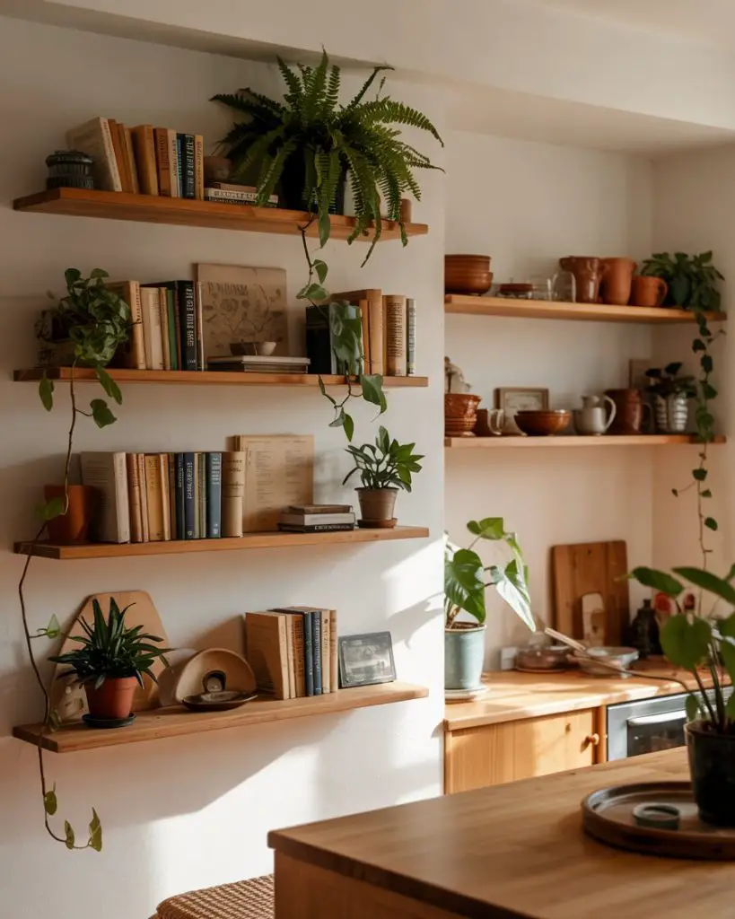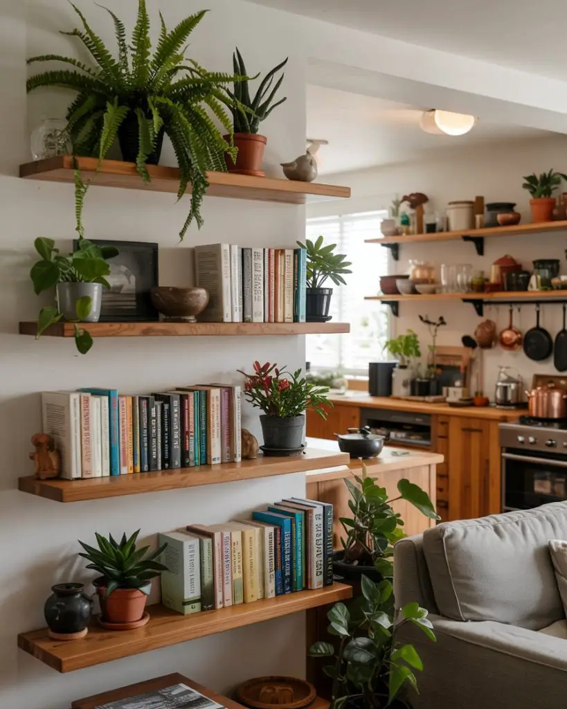 If you’ve got open shelving in the kitchen, echo that concept in the living area with a simple bookshelf or wall-mounted shelves. This creates visual rhythm and makes the whole space feel more curated. It’s a smart move in small apartment and townhouse layouts where closed storage can feel heavy. Style the shelves with a mix of books, plants, and a few decorative objects that tie into your kitchen’s color palette.
