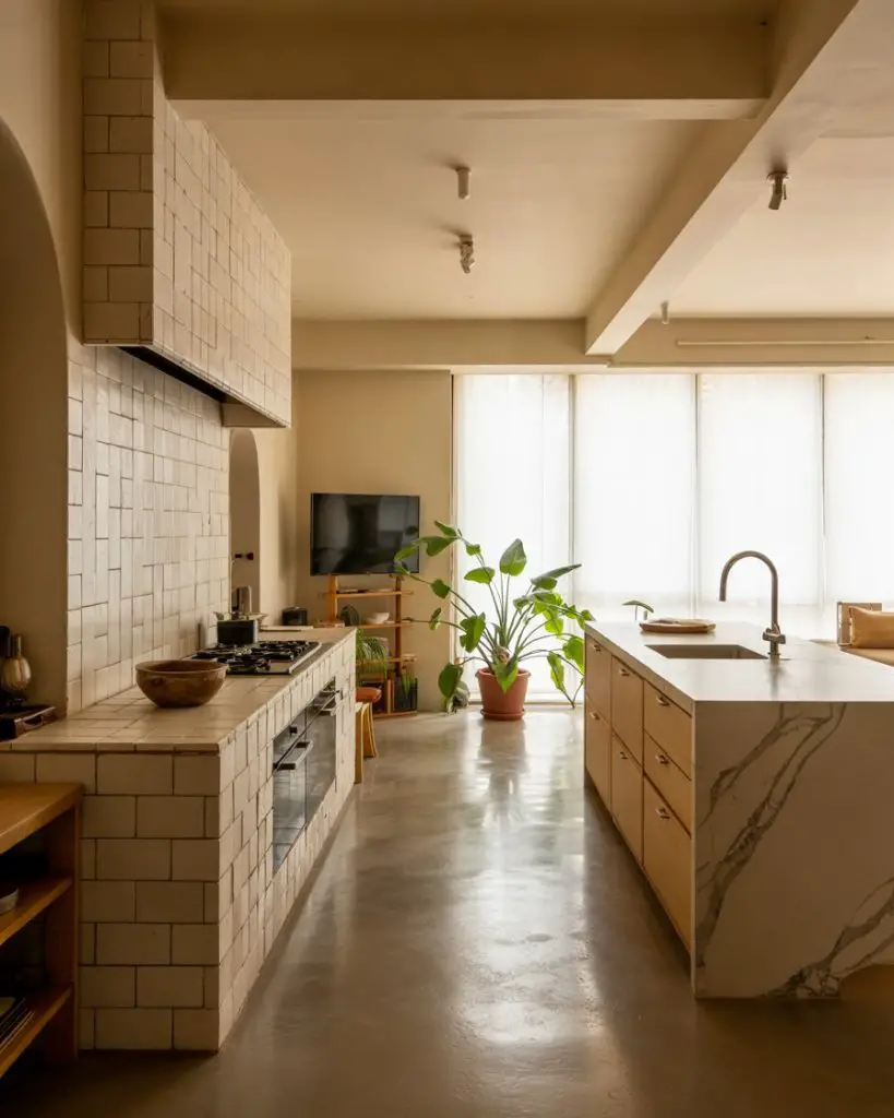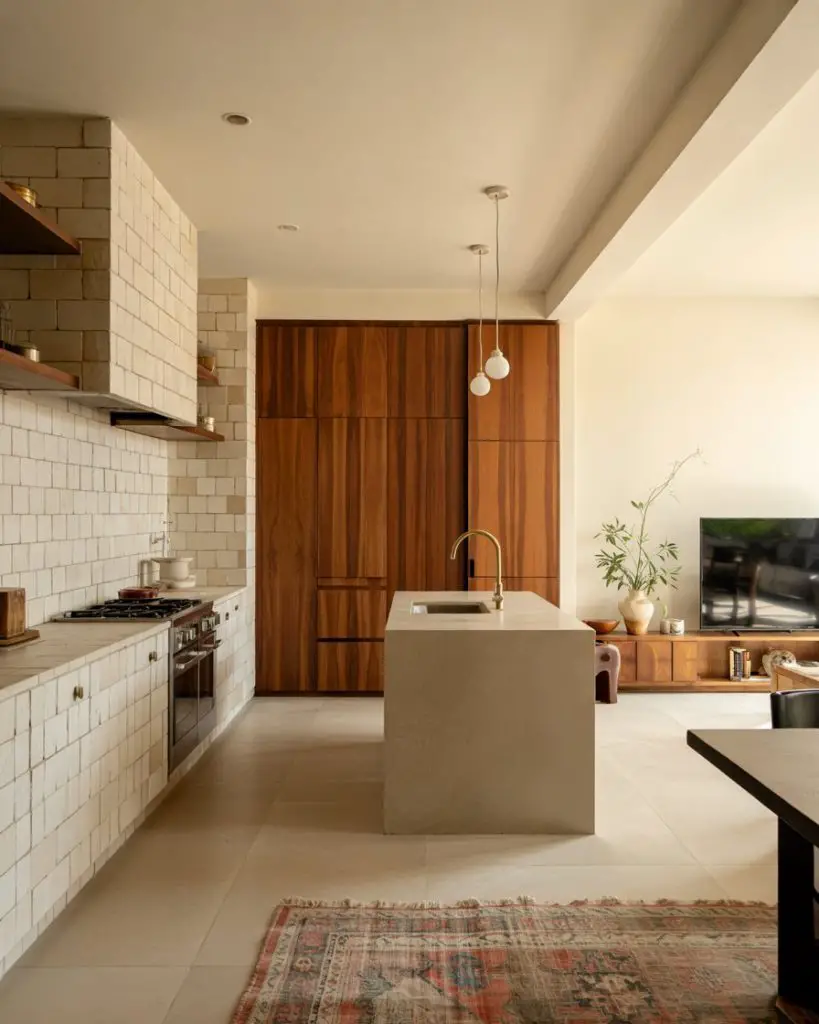 Where this works best: homes where the kitchen and living area share a single long wall, making the material transition feel natural rather than forced. If you’re working with a tile installer, order 10-15% extra material to account for cuts and future repairs—discontinued tile patterns are notoriously hard to match later. This is also a good opportunity to introduce texture; glossy tiles reflect light beautifully, while matte finishes feel more organic and forgiving with fingerprints and smudges.