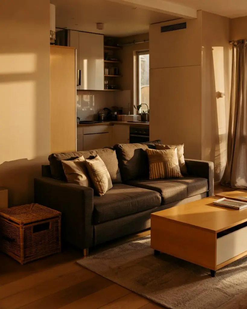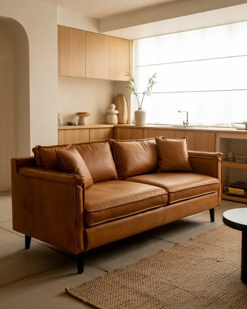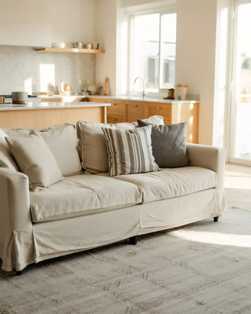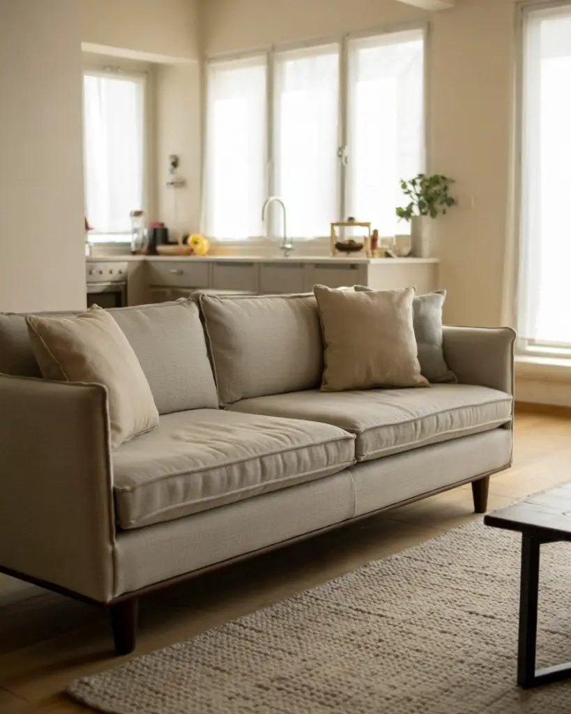 A common mistake is choosing oversized sectionals that dominate the room and make it hard to walk through the space comfortably. Before buying, measure not just the sofa dimensions but also the clearance around it—you’ll want at least 18 inches between the sofa back and any kitchen island or counter. If you already own bulky furniture, consider swapping out just one piece, like a heavy coffee table for a slim glass or acrylic version, to instantly lighten the visual weight.
