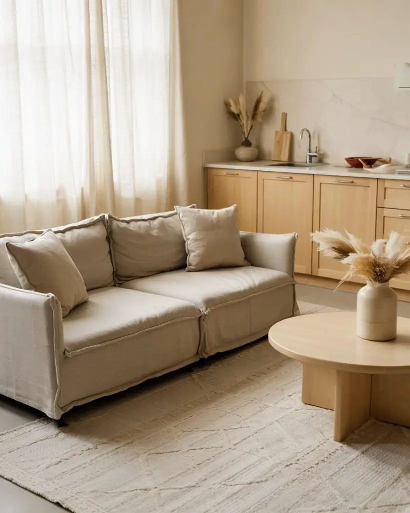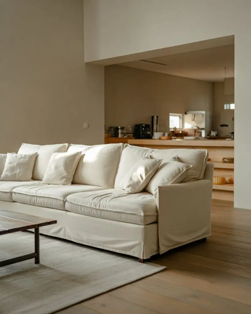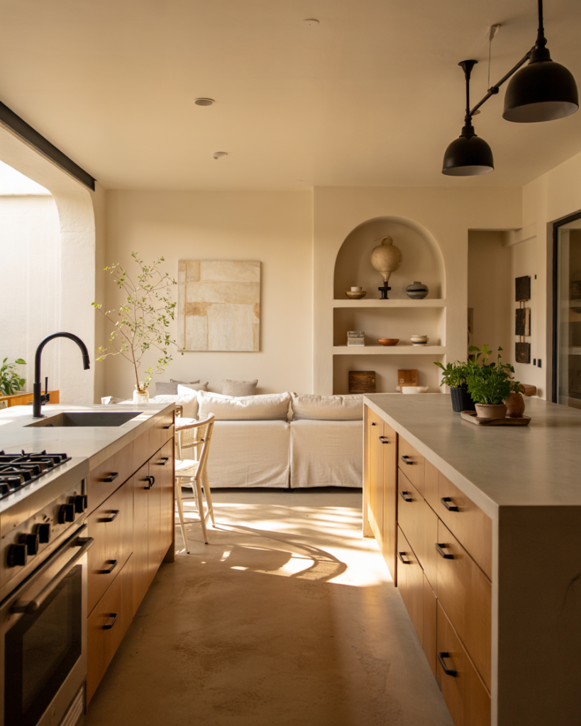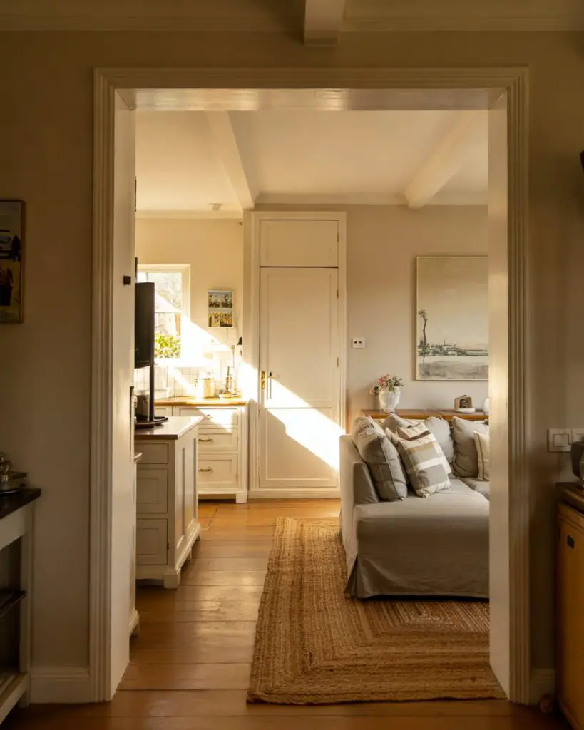 Where this works best: homes with lots of natural light, where neutrals won’t feel flat or dull. South-facing windows in particular amplify warmth, making creams and beiges glow throughout the day. If your space lacks natural light, swap cool grays for warmer taupes and add more ambient lighting through floor lamps and under-cabinet strips. The single accent color should appear in at least three places to feel intentional—pillows, art, and a vase, for example.