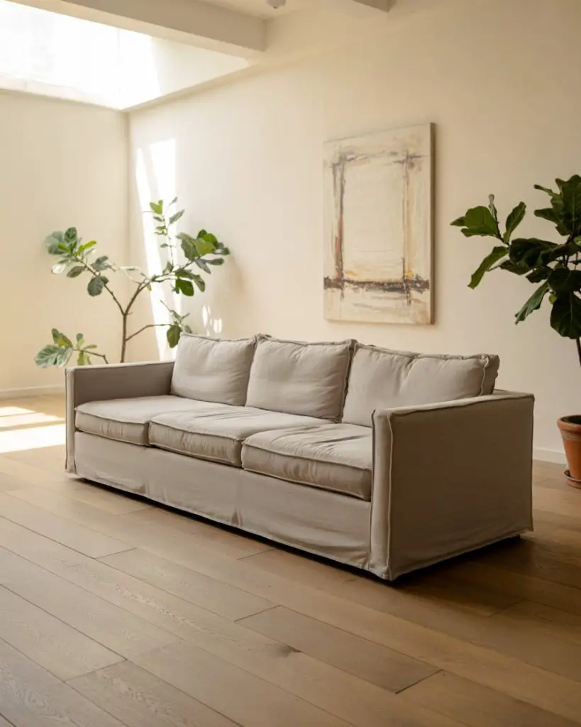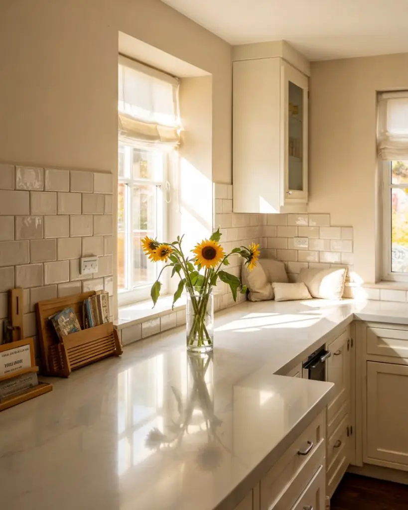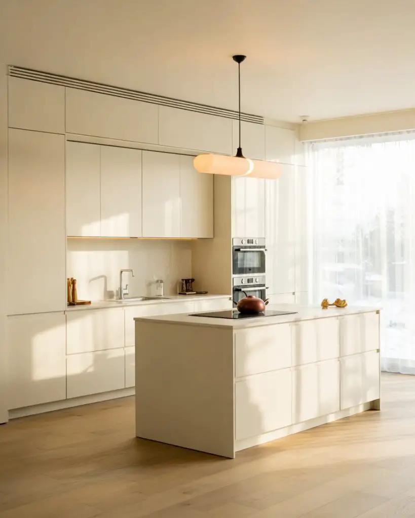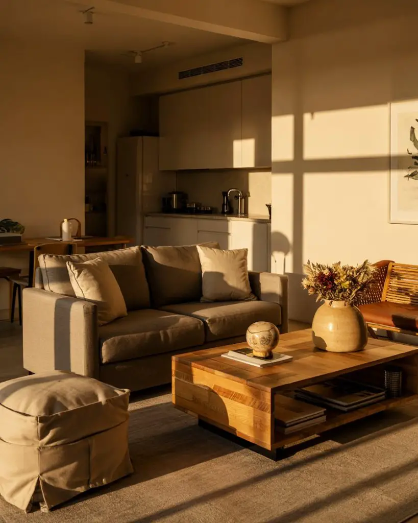Where this works best: homes with lots of natural light, where neutrals won’t feel flat or dull. South-facing windows in particular amplify warmth, making creams and beiges glow throughout the day. If your space lacks natural light, swap cool grays for warmer taupes and add more ambient lighting through floor lamps and under-cabinet strips. The single accent color should appear in at least three places to feel intentional—pillows, art, and a vase, for example.