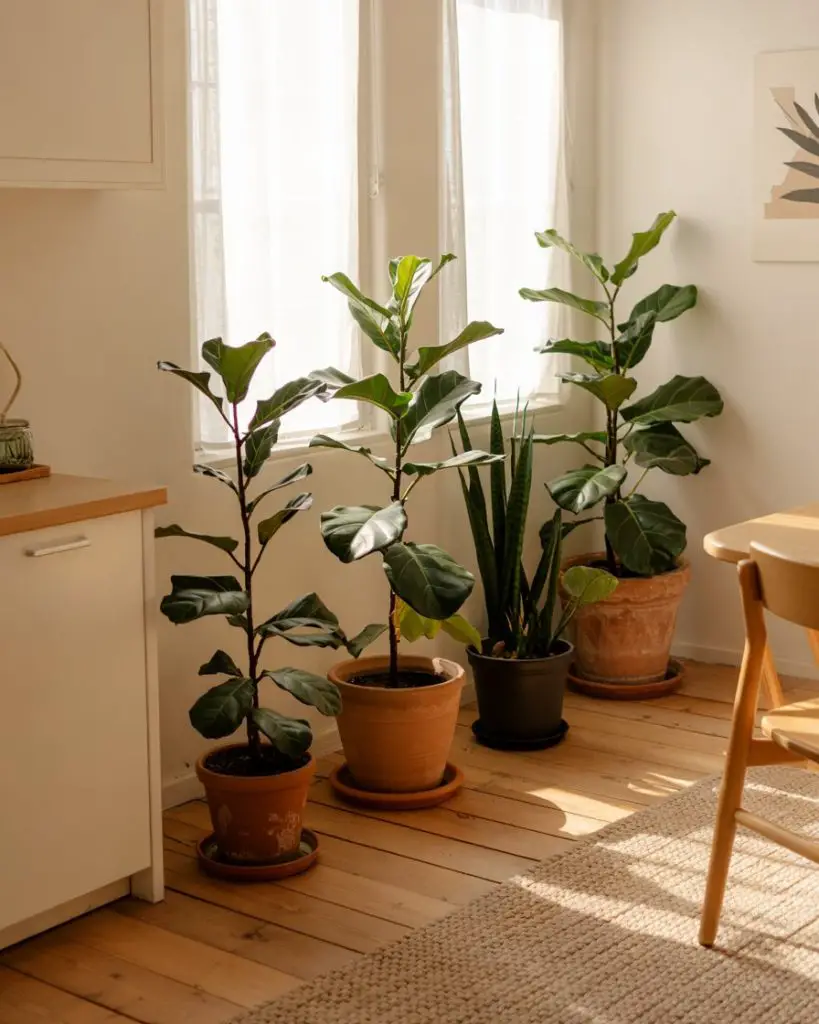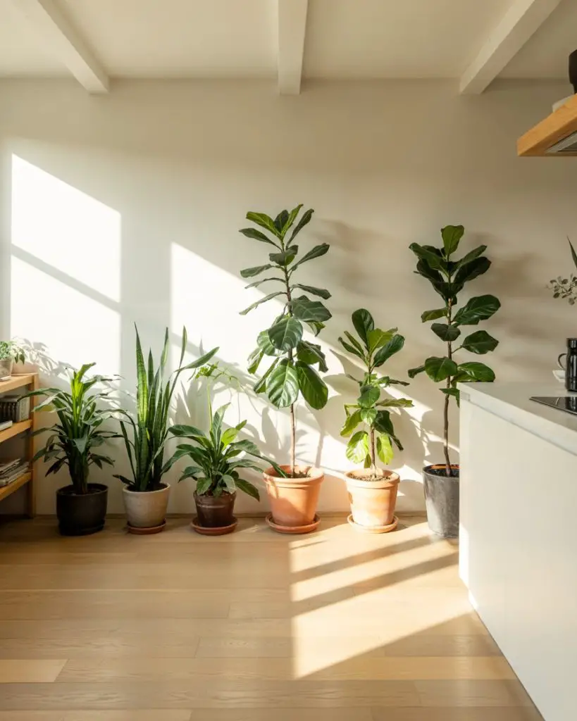 A row of potted plants or a tall fiddle-leaf fig can create a natural boundary between kitchen and living zones without blocking light or conversation. This is a particularly organic solution for Scandinavian and Japandi styles, where nature-inspired elements are central to the aesthetic. Choose low-maintenance varieties like pothos, snake plants, or rubber trees if you’re not confident in your plant-parenting skills—they tolerate neglect and low light surprisingly well.