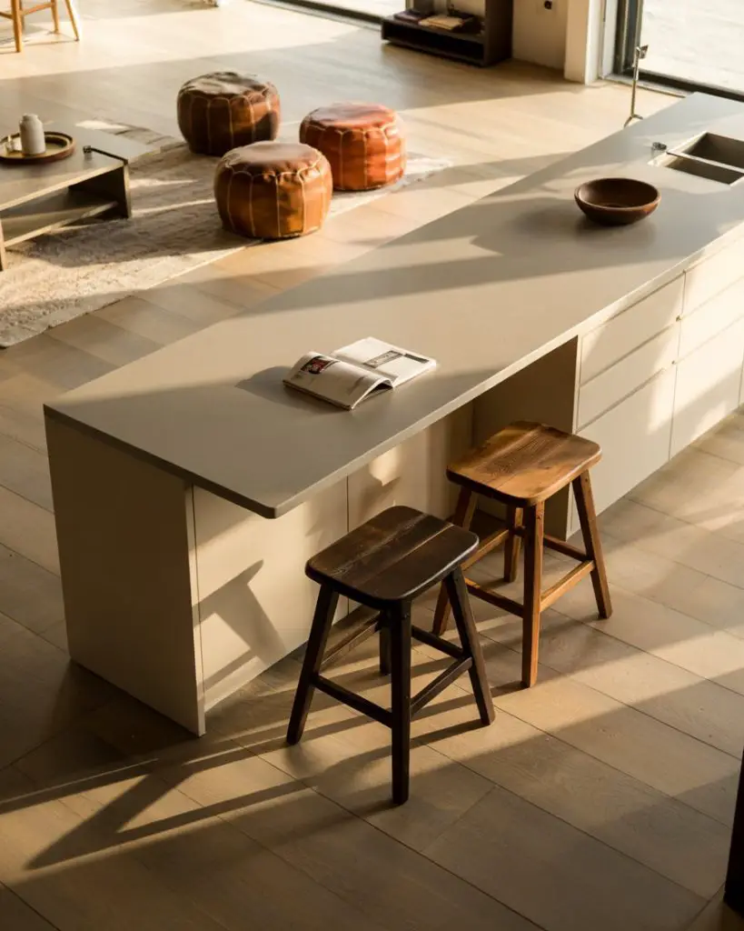 Backless stools at the kitchen island and movable poufs in the living area create flexible seating that you can arrange and rearrange as needed. This is especially useful when entertaining or when kids need a spot to do homework while you’re cooking. Look for stools that tuck completely under the island to keep pathways clear, and choose poufs with sturdy construction that can double as extra coffee table surface or footrests.