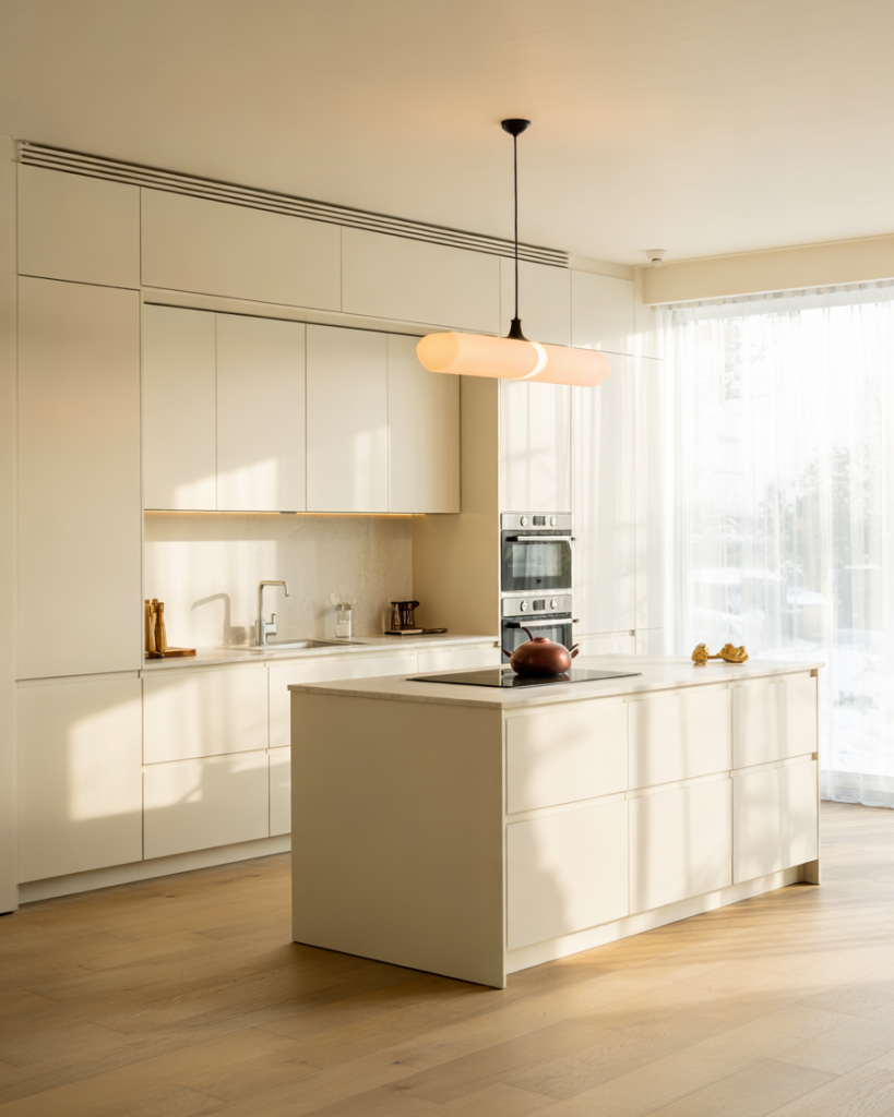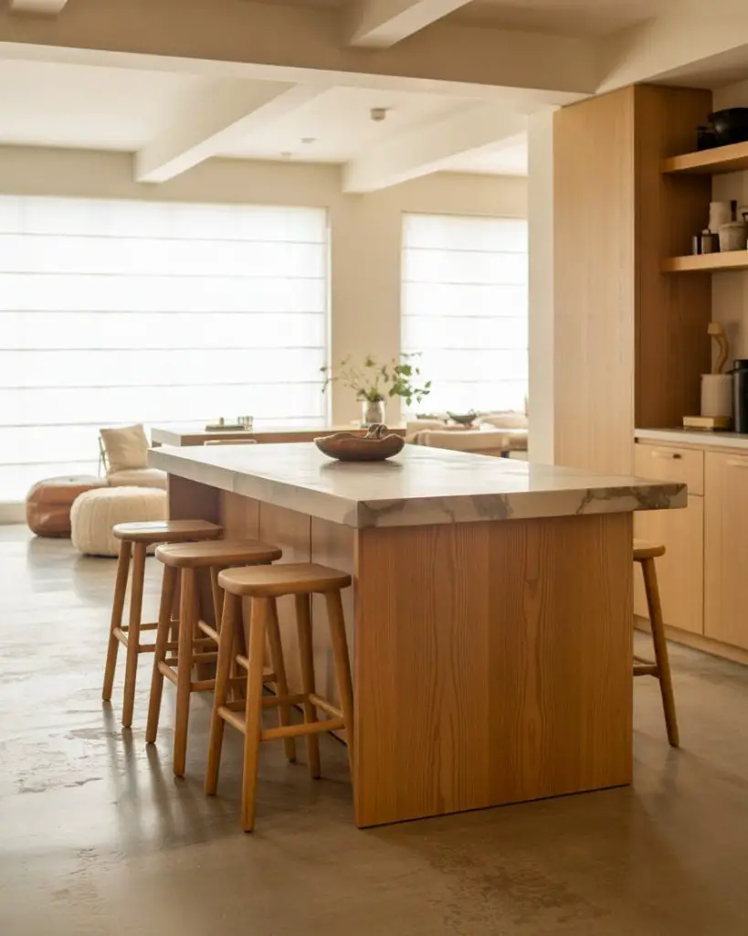 Using the same cabinet style and finish in both the kitchen and any built-ins in the living area creates a seamless look that’s very popular in Scandinavian and Japandi interior design. Think flat-panel cabinets in a matte white or warm oak extending from the kitchen into a media console or bookshelf in the living room. This strategy makes the space feel cohesive and intentional, even if the two zones serve completely different functions.
