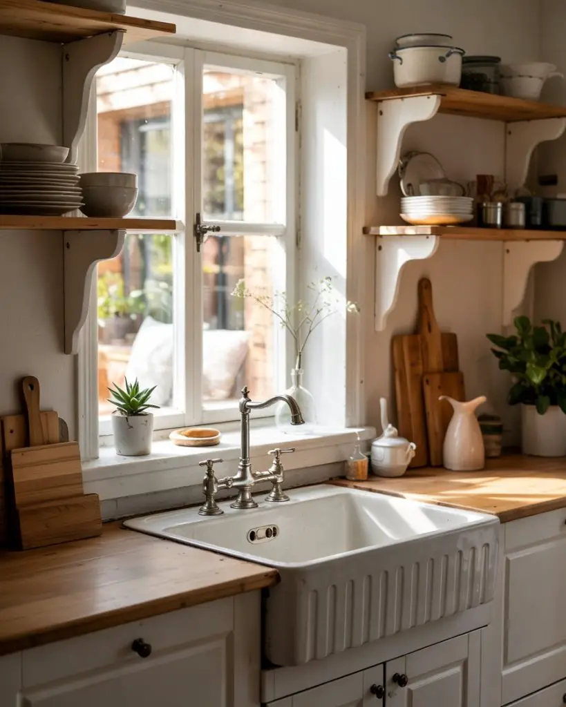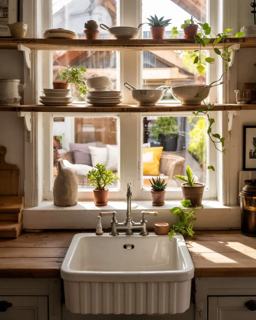 Ditching upper cabinets above the kitchen sink opens up the room visually and creates a natural connection to the living area beyond. Open shelving styled with everyday dishes, glassware, and a few plants feels approachable and lived-in, especially in Scandinavian or farmhouse-inspired kitchens. The trick is keeping it curated—too many items look cluttered, too few feel staged. Aim for a mix of functional pieces and a couple of decorative objects that tie into your overall color scheme.