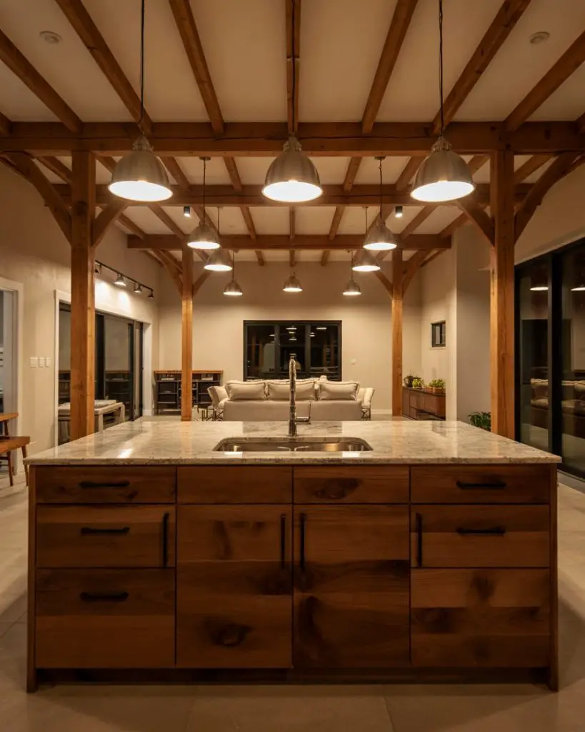 Pendant lights or a dramatic chandelier can define the boundary between kitchen and living spaces without adding physical walls. In barndominium designs, oversized industrial pendants above the island create a clear focal point, while recessed lighting in the living area keeps things subtle. This approach works in both modern and rustic settings, and you can adjust the mood with dimmers to shift from bright task lighting during cooking to softer ambient light for movie nights.
