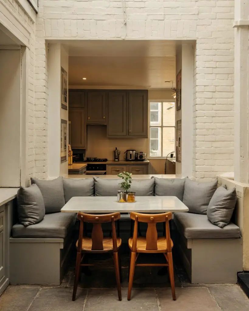 Where this works best: narrow spaces where a traditional dining setup would block foot traffic. The banquette can be as simple as a plywood frame with foam cushions wrapped in durable fabric, or you can go custom with a local carpenter for a tailored fit. If you’re in a region with distinct seasons, choose a fabric that can handle humidity and temperature swings—performance fabrics like Crypton or Sunbrella are surprisingly stylish now and stand up to spills and pet hair.