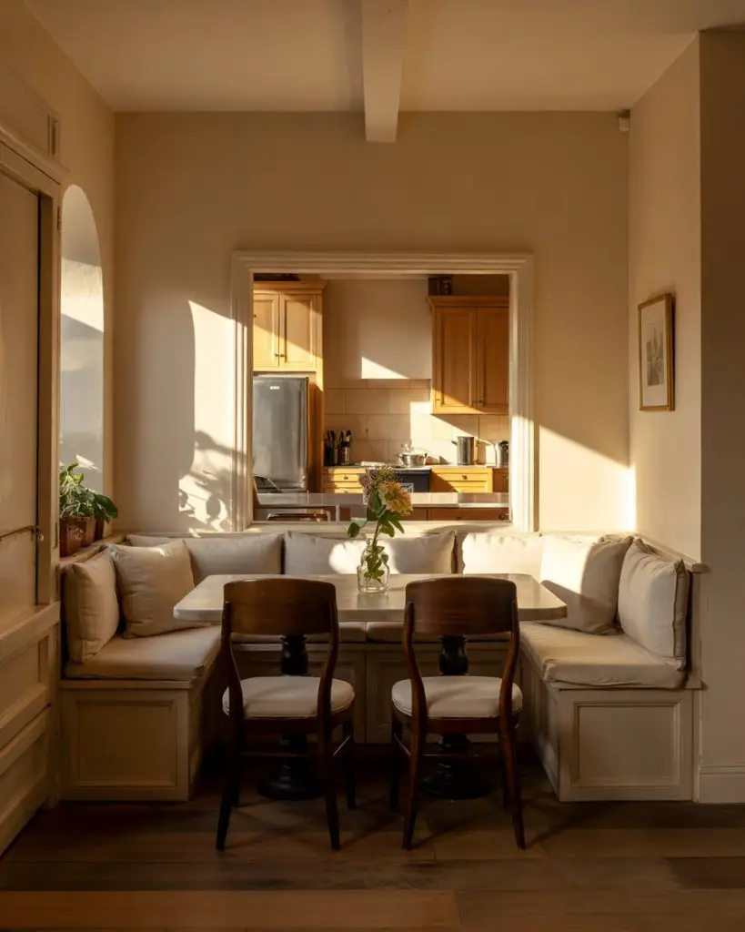 A built-in banquette along one wall can replace a traditional dining room table in open layouts, especially in townhouse designs where square footage is limited. Pair it with a simple table and a couple of chairs on the opposite side, and you’ve got flexible seating that doesn’t visually separate the kitchen from the living area. The bonus? Built-in storage underneath for linens, seasonal décor, or kids’ craft supplies.