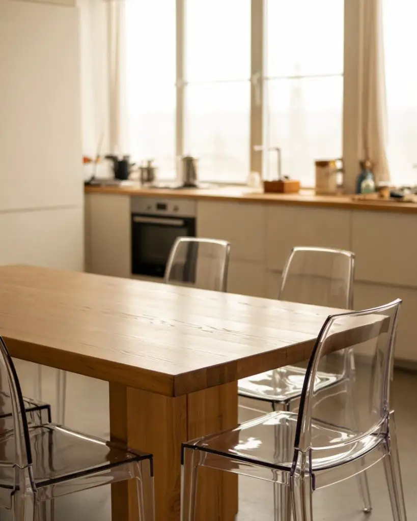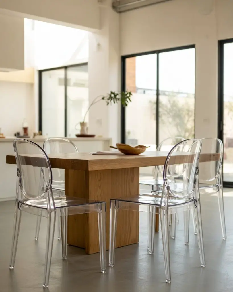 Transparent furniture is having a moment, and for good reason—it takes up physical space without adding visual weight. Swap out solid wood or upholstered dining chairs for clear acrylic or glass versions, and suddenly your open kitchen living room feels twice as airy. This trick is especially effective in small apartment settings where you want the floor plan to feel as open as possible. Pair them with a solid wood or marble table to balance the look.