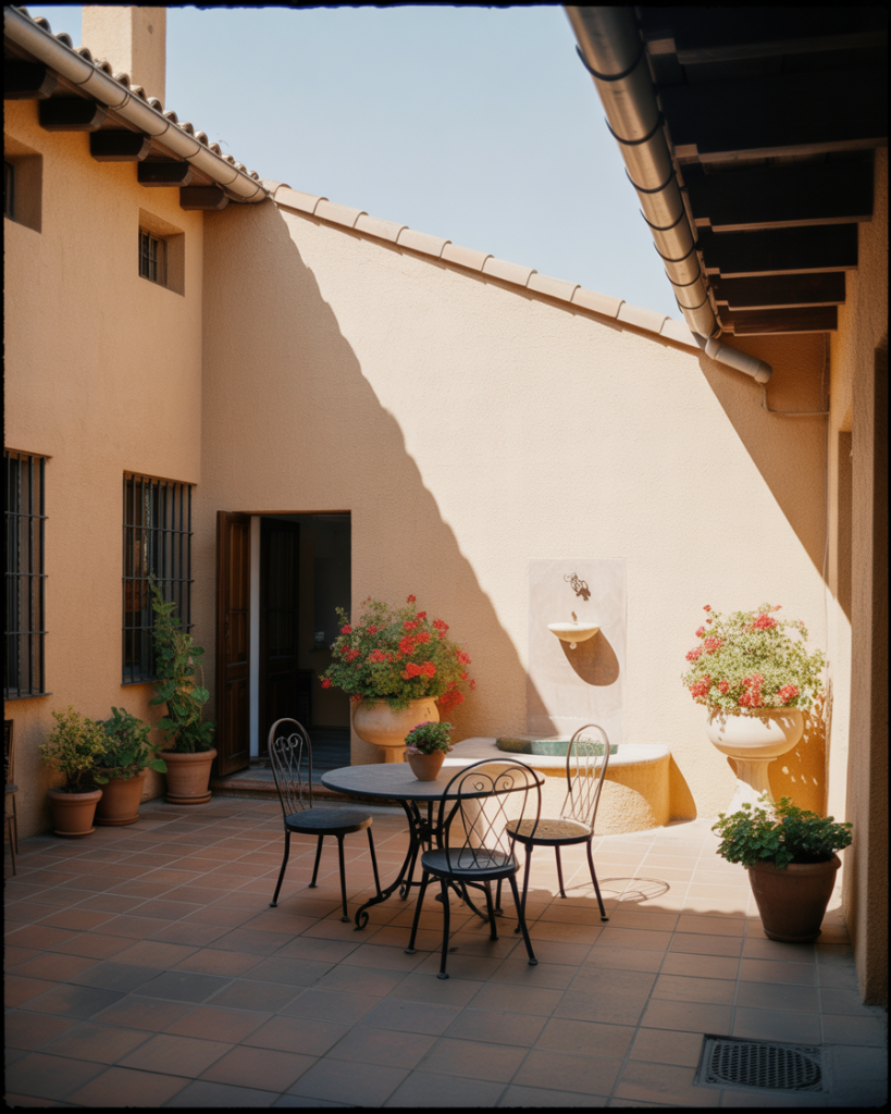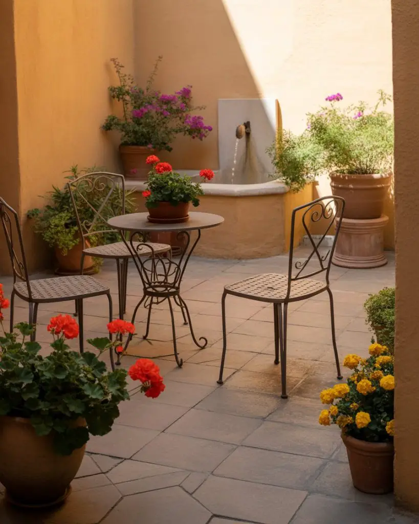 Inspired by old-world courtyards, a Spanish style patio features warm terracotta tiles, wrought iron accents, and lush potted plants. Add a small fountain or wall-mounted water feature for ambiance, and hang colorful ceramic tiles as art. This style works especially well in the Southwest and Southern California, where the climate supports year-round outdoor living. It’s also a great way to add privacy and intimacy to a small spaces setup, as the enclosed courtyard feel makes even a modest patio feel like a hidden retreat.