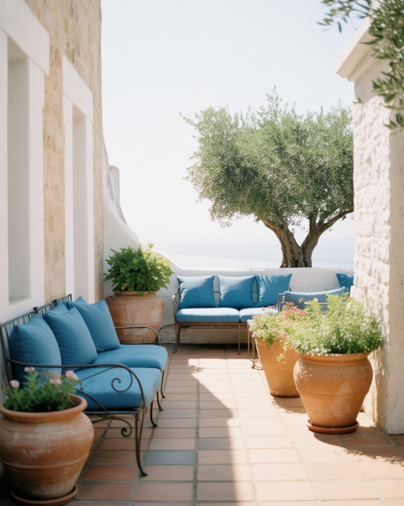 Crisp white walls, cobalt blue accents, and terracotta pots define the Mediterranean patio aesthetic. This style borrows from Greek islands and coastal Italy, emphasizing simplicity, natural materials, and a connection to the sea. Use white-painted furniture, blue cushions, and plenty of greenery—olive trees, lavender, and succulents all fit the look. It’s a refreshing choice for small spaces that need a calming, cohesive color palette, and it photographs beautifully for Pinterest-worthy inspiration.