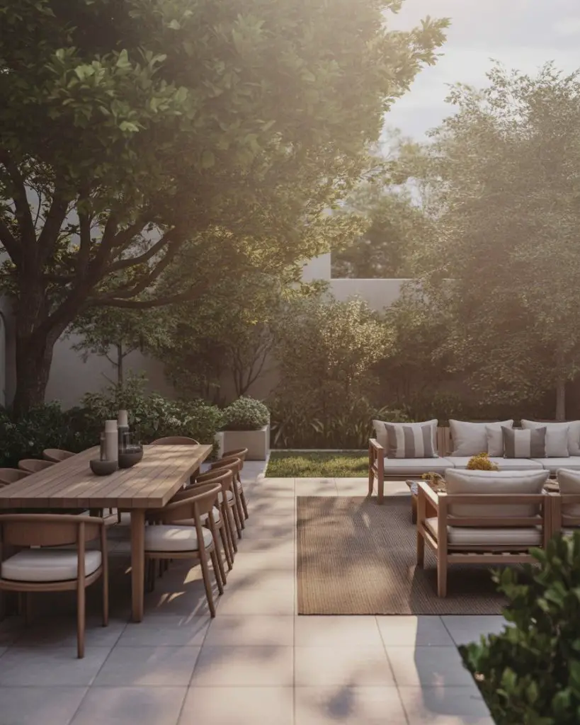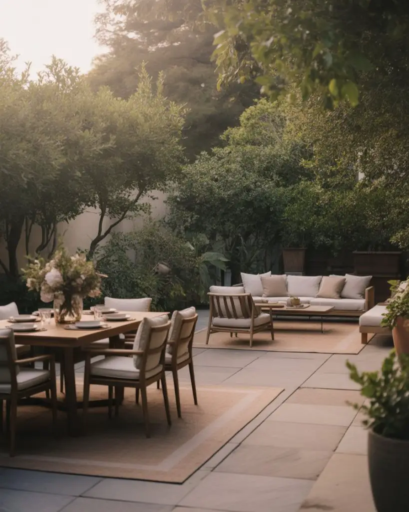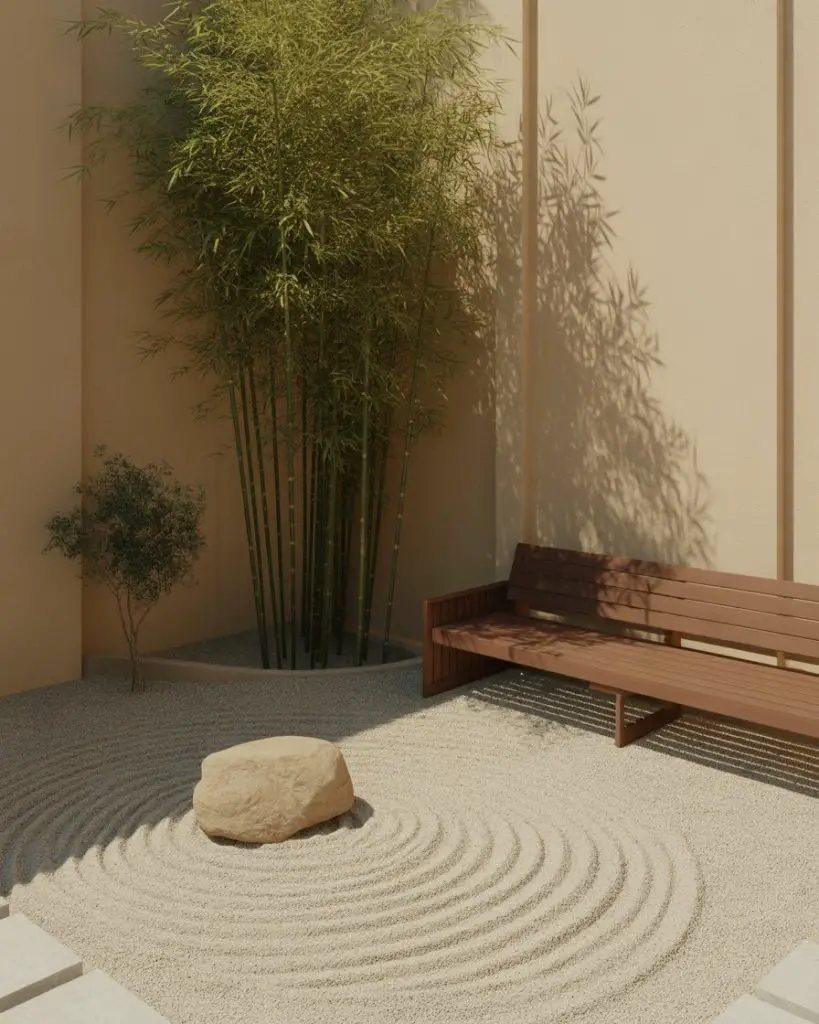 A Zen-inspired patio prioritizes simplicity, natural materials, and a sense of calm. Think gravel or pebble flooring, a single statement rock or sculpture, and minimal seating—maybe just a wooden bench or a pair of floor cushions. This style is ideal for small spaces where you want to create a meditative retreat rather than an entertaining zone. It’s also a great match for modern architecture, where the clean lines and restrained palette complement the home’s design.