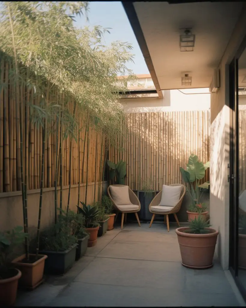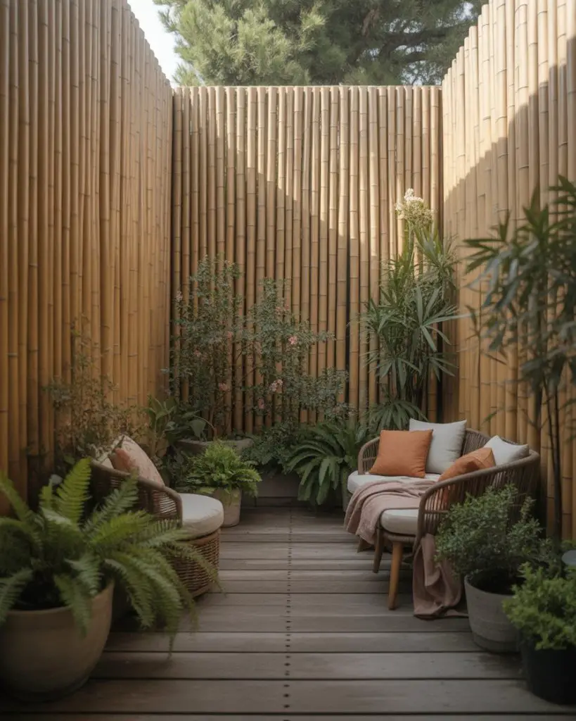 If your patio feels too exposed, privacy panels can transform it into a secluded retreat. Choose lattice screens, bamboo fencing, or even living walls with climbing vines. These barriers block sightlines from neighbors or the street without making the space feel closed off. They also provide wind protection and can support hanging planters or string lights. This idea is a lifesaver for apartment balconies and townhome patios where you’re close to other units.
