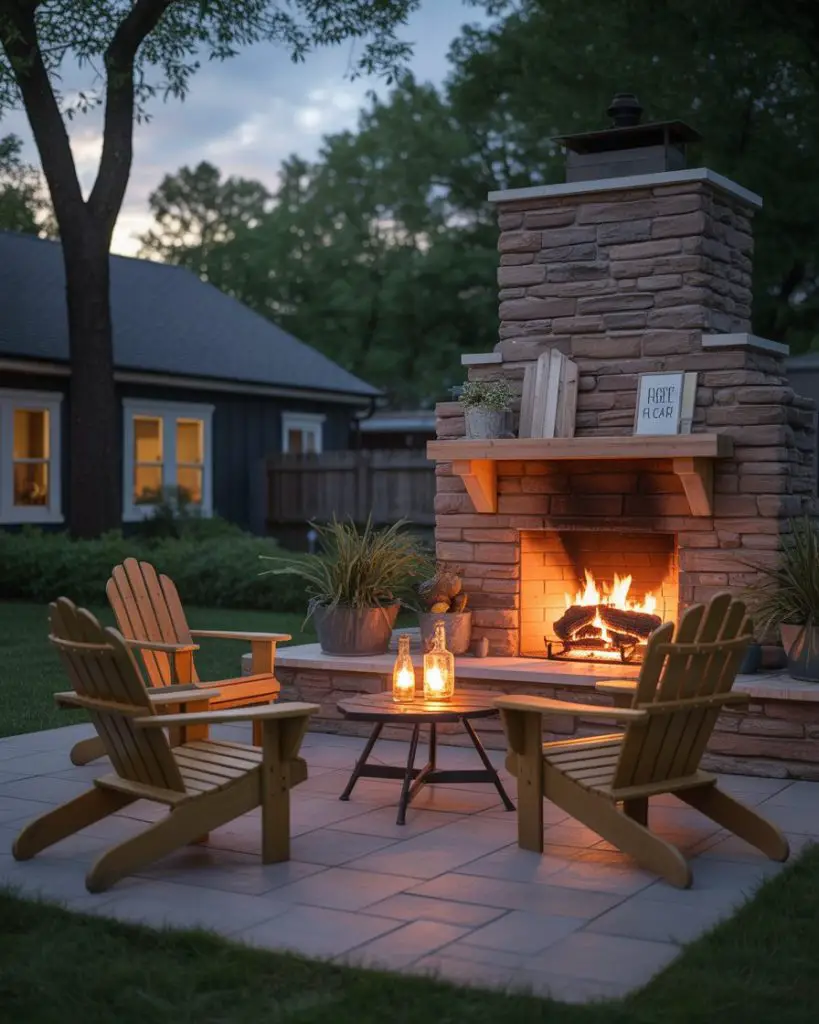 An outdoor fireplace creates instant drama and warmth. Whether you choose a stacked stone design, a modern steel unit, or a traditional brick hearth, the fireplace becomes the anchor of your patio. Arrange seating in a semi-circle facing the fire, add a mantel for candles or seasonal décor, and you’ve got a space that works from spring through fall. This idea is especially popular in cooler climates where outdoor season is shorter, and every bit of warmth extends usability.