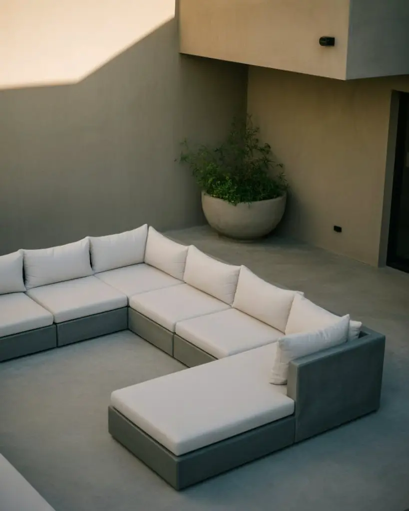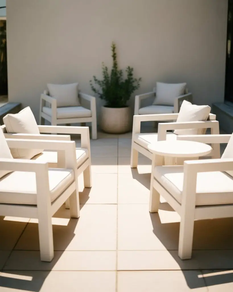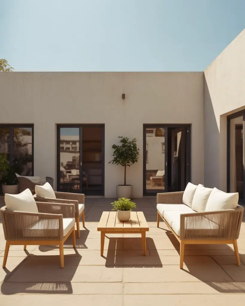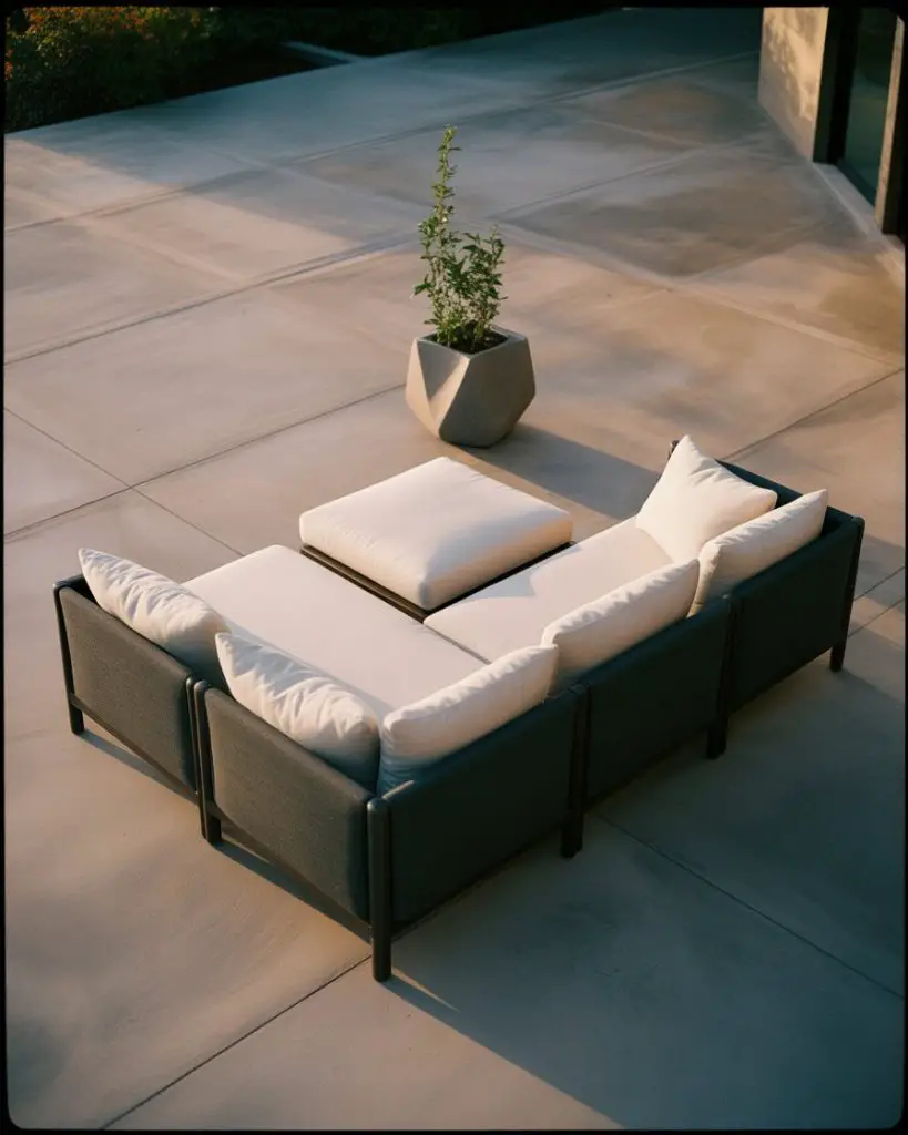 Clean lines, neutral tones, and purposeful furniture define this approach. A modern minimalist patio works best in small spaces modern settings where every piece counts. Choose low-profile seating in shades of gray, white, or tan, and add texture through outdoor pillows or a woven throw. Avoid busy patterns—stick to solids or subtle geometric prints. This style is all about calm, and it pairs beautifully with concrete planters and streamlined lighting.