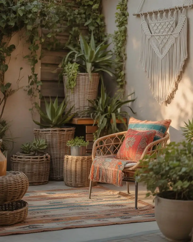 Layered rugs, macramé hangings, and piles of patterned pillows define the bohemian patio. This style embraces color, texture, and a collected-over-time vibe. Mix Moroccan poufs with rattan chairs, hang a tapestry as a backdrop, and add string lights or lanterns for ambiance. It’s perfect for decorating enthusiasts who love to switch things up seasonally and aren’t afraid of bold prints. This look also translates well to small spaces, where every surface becomes an opportunity for personal expression.