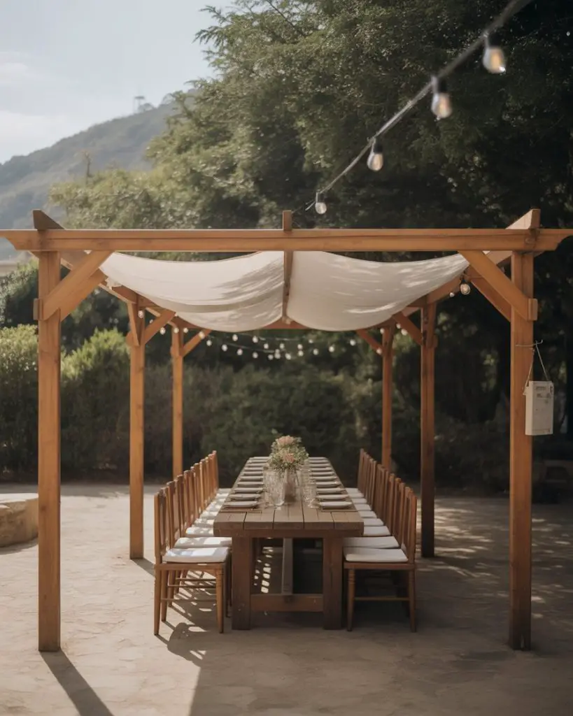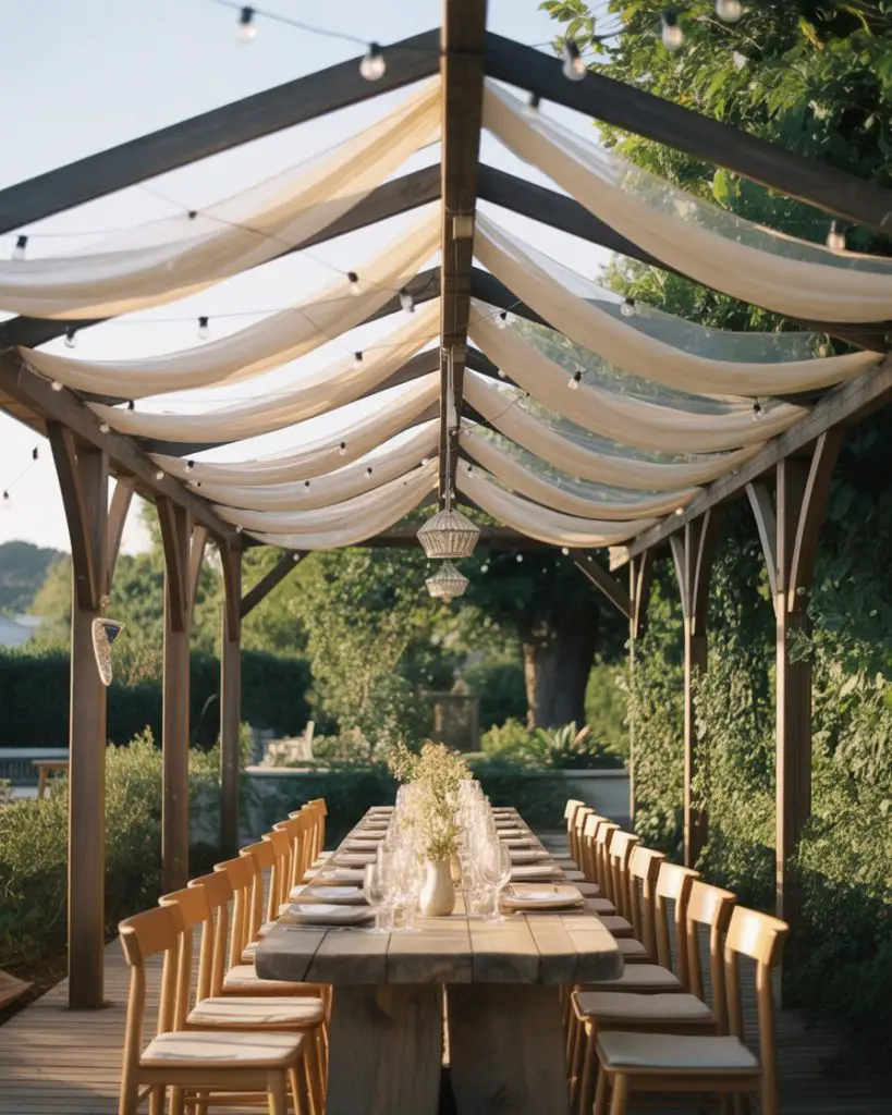 A covered patio extends your usable outdoor season and protects furniture from surprise rain. Whether you install a pergola with a retractable canopy or build a permanent roof structure, the key is creating a dedicated dining zone that feels like an outdoor room. Add string lights, a ceiling fan, and a long farmhouse table to make it the go-to spot for Sunday brunches and summer dinners. This idea works especially well in backyards with enough square footage to anchor a permanent structure.