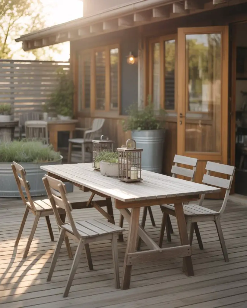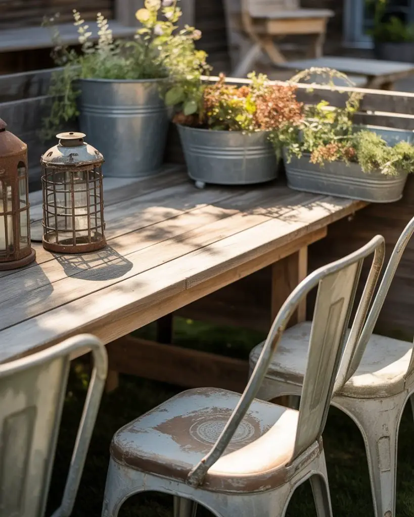 If you love weathered wood, vintage finds, and a lived-in feel, a rustic farmhouse patio might be your style. Think reclaimed barn wood tables, metal lanterns, and mismatched seating that looks collected over time. Layer in galvanized planters, a wooden ladder for hanging plants, and maybe an old watering can as décor. This aesthetic works beautifully in country settings or suburban homes with a bit of land, where the patio can spill out into the yard without defined borders.
