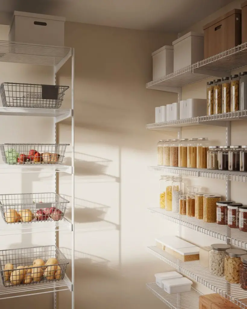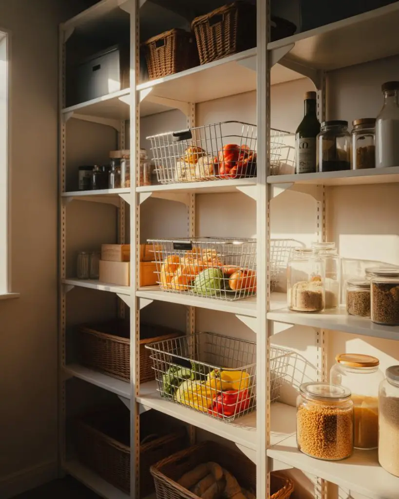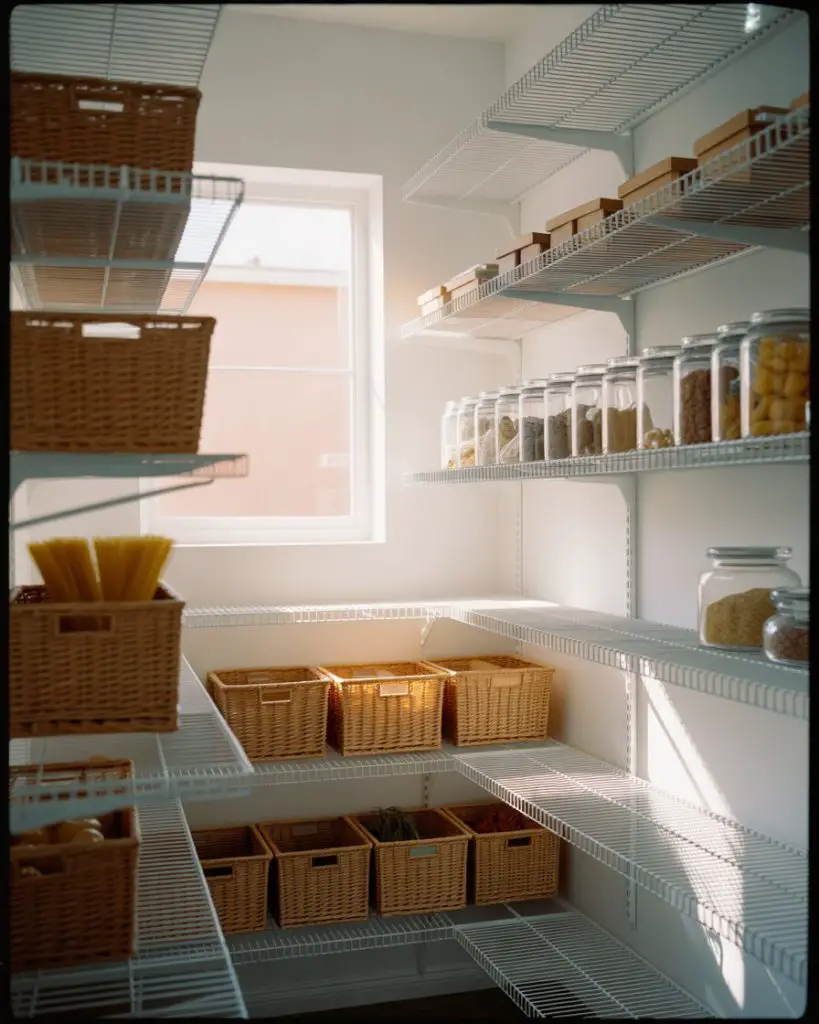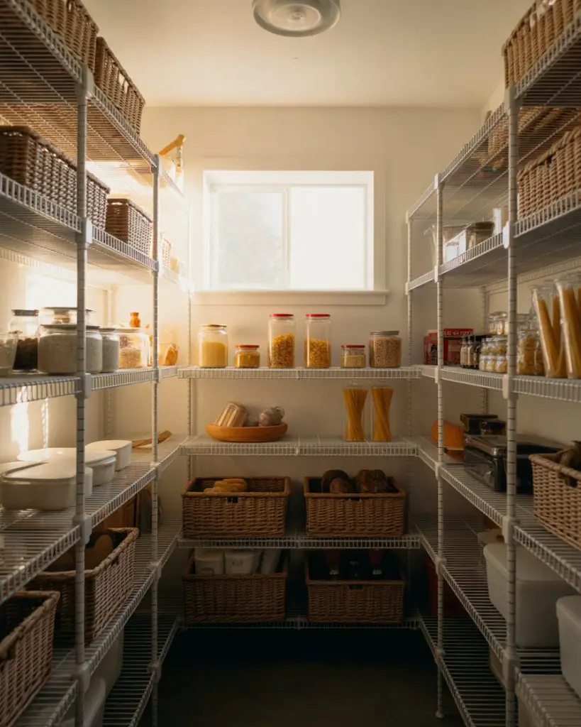 A walk-in pantry designed with open shelving creates a boutique-style experience where everything is visible at a glance. Use wire shelf units along the back wall and introduce baskets in varying sizes to corral snacks, baking supplies, and overflow items. The transparency of wire allows air to circulate around dry goods, and the open design prevents the “out of sight, out of mind” problem that plagues closed cabinets. This approach works especially well in homes where multiple family members need quick access without rummaging.