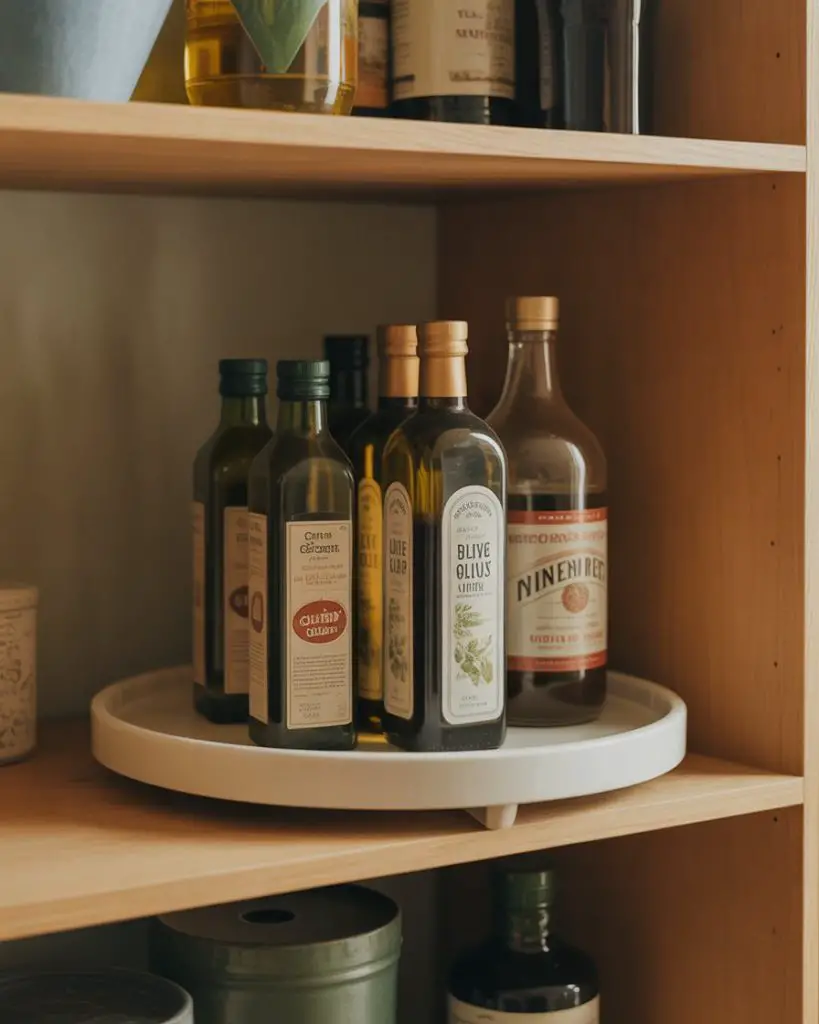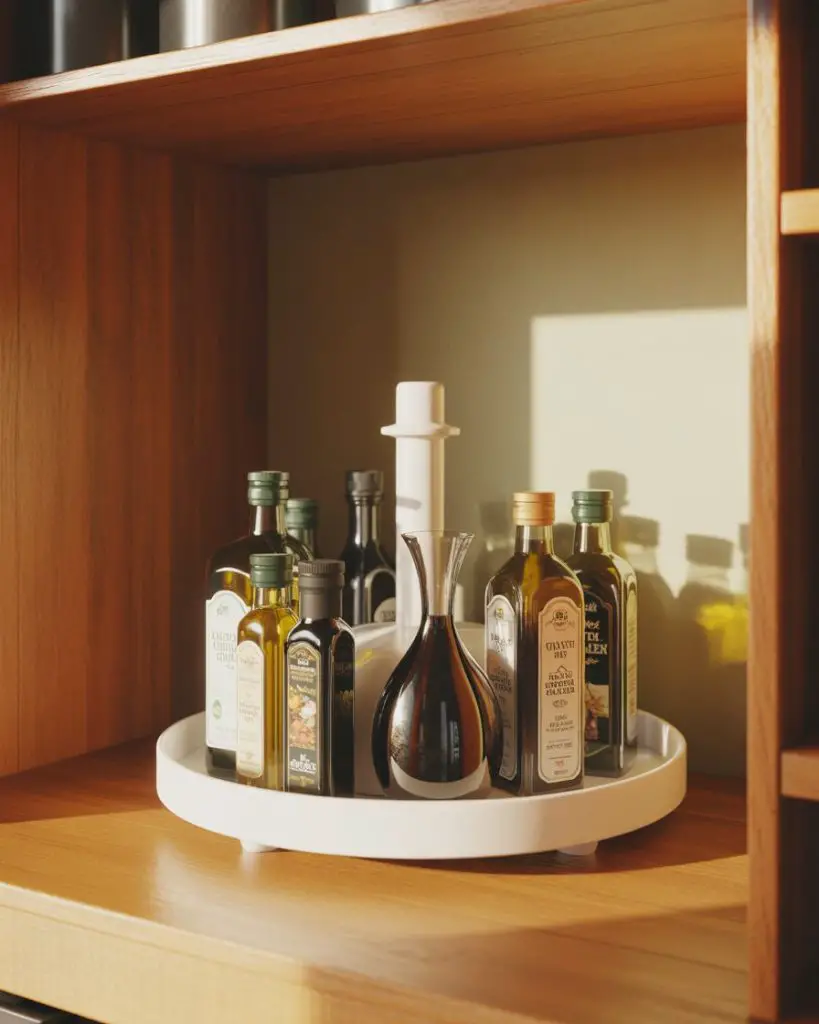 Corner spaces and deep shelves create dead zones where items disappear, but lazy Susan turntables bring everything within reach with a simple spin. Place them on upper shelves for oils, vinegars, and sauces, or on lower shelves for canned goods and condiments. The circular motion means you can access items at the back without unloading the entire shelf—a game-changer in large pantries where depth makes retrieval challenging. Choose turntables with raised edges to prevent bottles from sliding off during rotation.