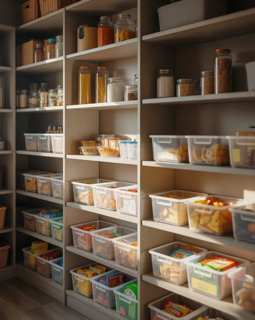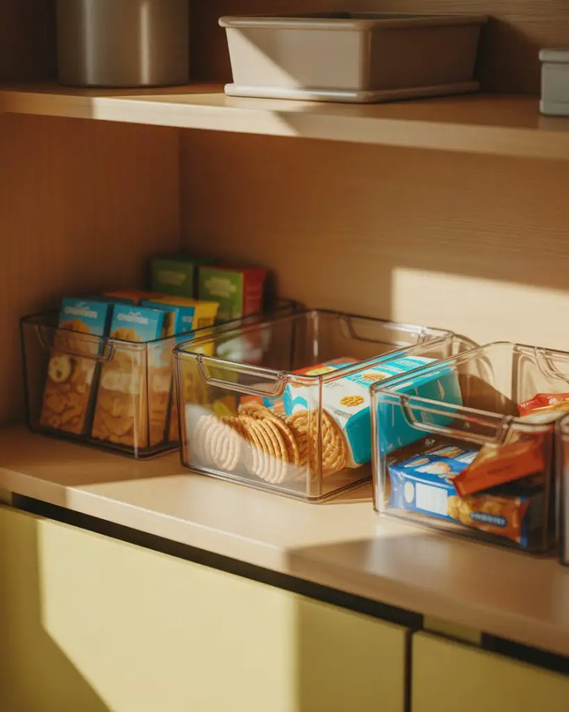 Drawing inspiration from Kmart organizing solutions, this idea centers on affordable clear bins that maximize visibility and function. The beauty of this system is its accessibility—most items can be found at big-box retailers, making it a realistic option for families working within tight budgets. Stack bins vertically to use every inch of shelf space, and designate each container for a specific category: breakfast items, snacks, baking essentials. The uniform shape creates a clean grid that’s both practical and visually satisfying.