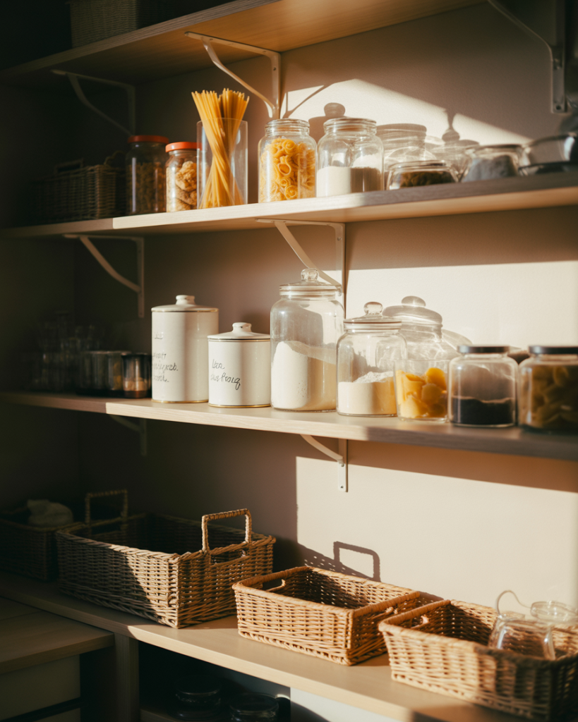 Interior designers often recommend this approach for clients who want their home to feel magazine-ready without constant upkeep. The key is choosing baskets with handles for easy removal—you’re more likely to pull them out, use what’s inside, and return them if the process feels effortless. This matters especially in busy households where organization systems need to survive real life, not just look good in a staged photo. A well-planned aesthetic pantry becomes a space you actually want to open.