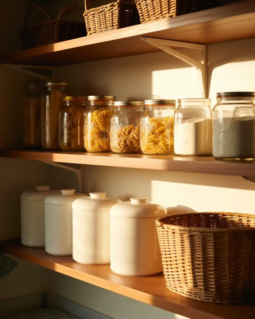 Open pantry shelving in or adjacent to the kitchen requires a commitment to visual consistency, but the payoff is a space that feels both functional and decorative. Choose a family of containers in coordinating materials—glass jars with wooden lids, white ceramic canisters, woven baskets in natural tones—and transfer staples into these vessels. Arrange them with intention, grouping by height and creating small vignettes that feel collected rather than chaotic. This approach works best when you’re willing to maintain the system and keep surfaces tidy.