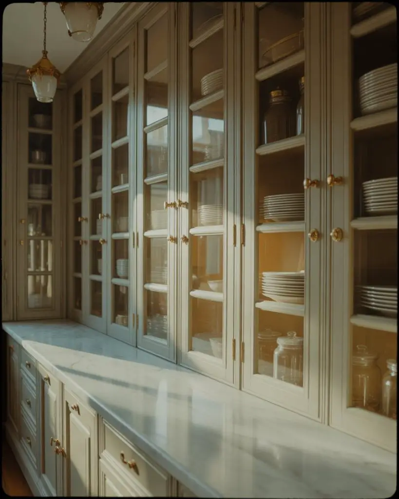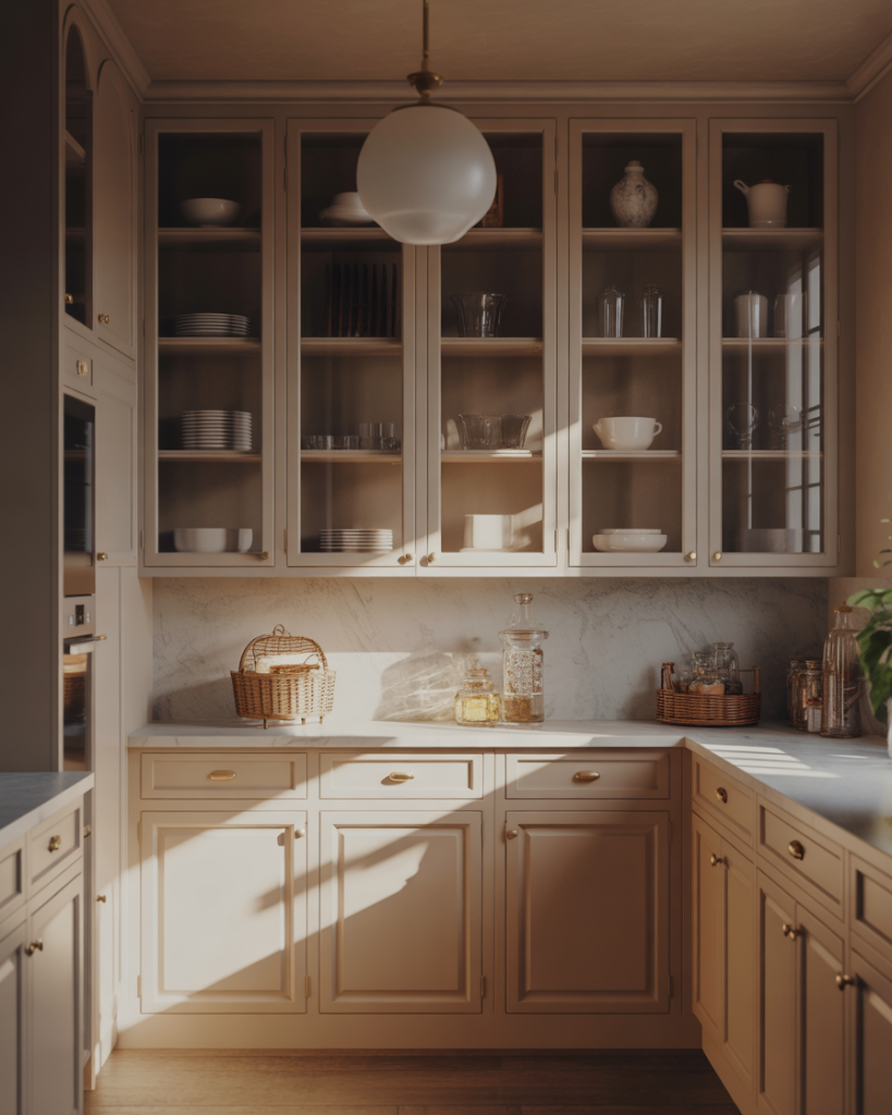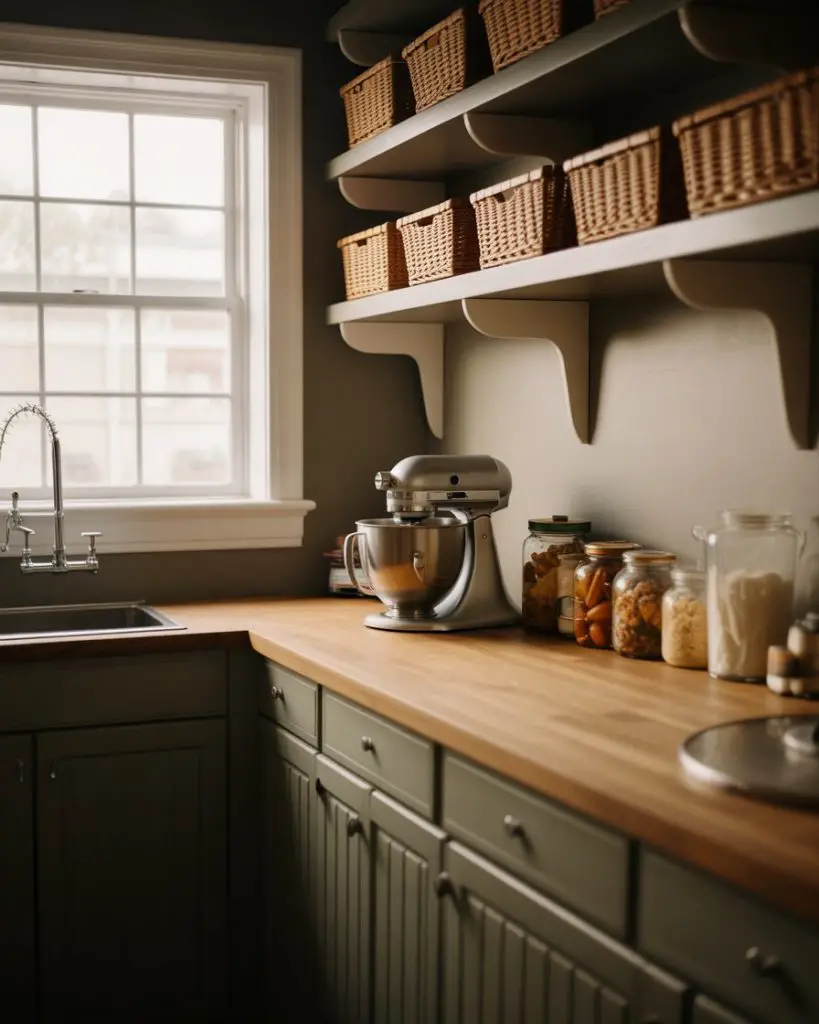 A butlers pantry bridges your kitchen and dining areas, making organization both functional and presentable. Install glass-front cabinets along one wall to display prettier items—matching canisters, vintage tins, specialty oils in attractive bottles. Behind closed doors on the opposite side, store everyday chaos: bulk snacks, mismatched Tupperware, backup paper goods. This dual approach keeps entertaining supplies accessible while hiding the visual clutter that accumulates in active households.
