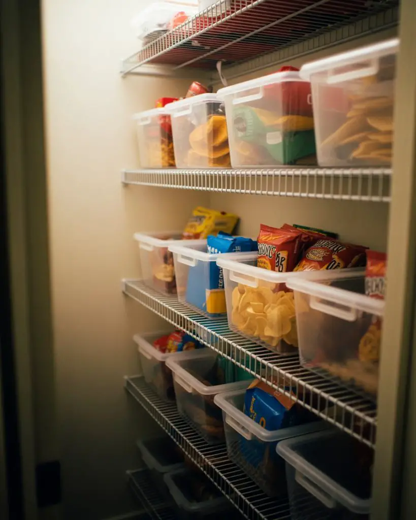You don’t need expensive container stores when Dollar Tree offers surprising solutions for pantry chaos. Stock up on acrylic bins, plastic baskets, and even small rectangular containers perfect for corralling snack packs or sauce packets. The trick is buying multiples of the same item so your pantry looks intentional rather than cobbled together. Group similar sizes on each shelf—all small bins on one level, medium on another—to create visual rhythm despite the budget price point.