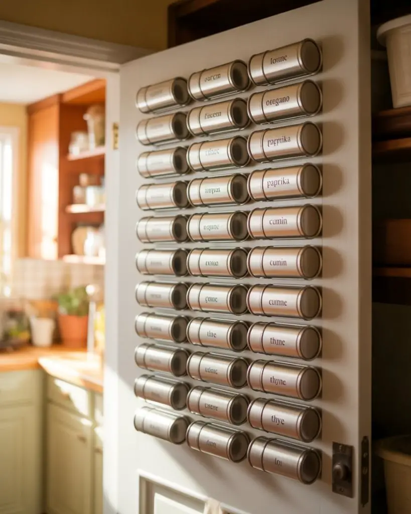 When floor and shelf space are limited in small kitchen setups, look upward and sideways for opportunities. Mount magnetic spice racks on the inside of pantry doors or on any metal surface, freeing up shelf real estate for bulkier items. The magnetic tins keep spices visible and accessible while adding virtually no footprint to your existing storage. This vertical thinking is crucial in small space environments where traditional solutions don’t fit. Paint or label the tin lids for easy identification from below.