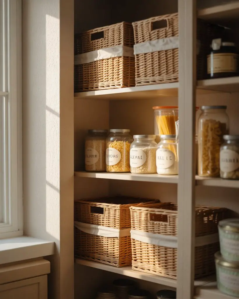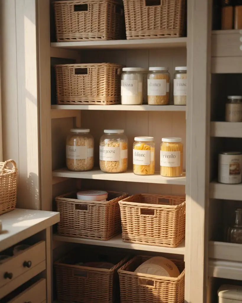 3. Aesthetic Pantry Closet with Woven Baskets and Labels