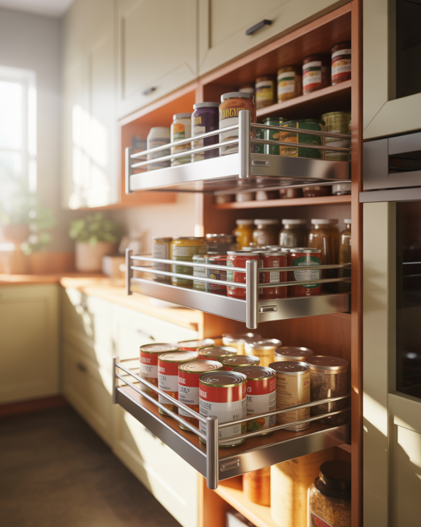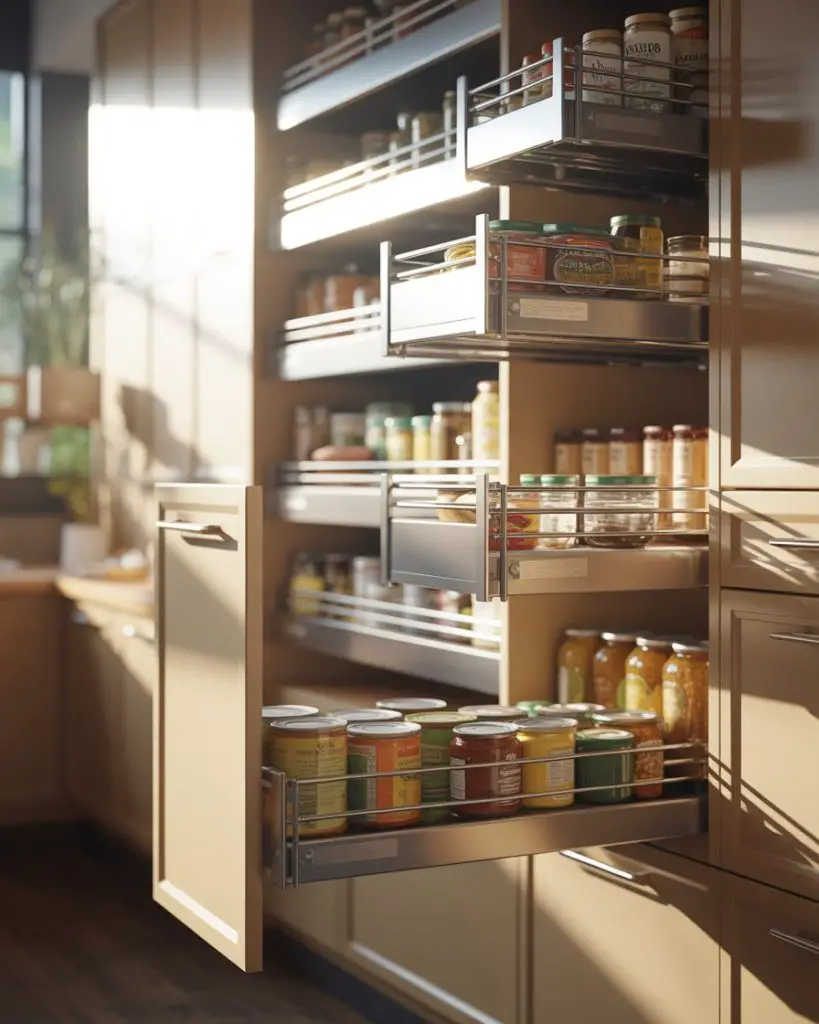 Where it works best: galley kitchens, apartments, and any space where traditional pantry depth would block pathways or overwhelm the room. The pull-out mechanism brings everything to you rather than forcing you to reach into dark corners. One homeowner in Brooklyn installed a narrow pull-out in the six-inch gap beside her refrigerator and now stores forty spice jars in a spot that was previously useless. It’s the ultimate example of working with what you have instead of wishing for more square footage.