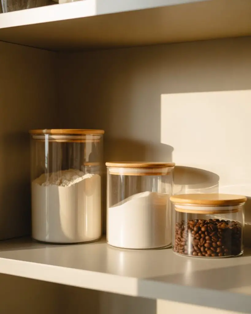 Glass canisters bring a sense of calm and order to your pantry, especially if you’re leaning into a minimalist approach. The transparency lets you see exactly how much flour, sugar, or coffee you have left, which reduces overbuying and waste. They also photograph beautifully, which explains their popularity on Pinterest among users who want their kitchen to feel both functional and photogenic. Look for versions with airtight bamboo or silicone lids.