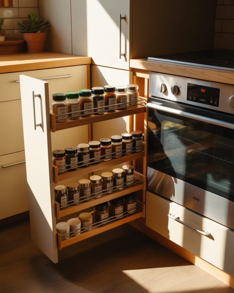 That narrow gap between your fridge and counter? It’s prime real estate for a slide-out spice rack. These slim, vertical units pull out like a drawer and can hold dozens of spice bottles in a footprint that’s barely five inches wide. They’re ideal for small kitchens where every square inch matters, and they keep spices accessible without cluttering your shelves or counters. Installation usually requires minimal hardware.