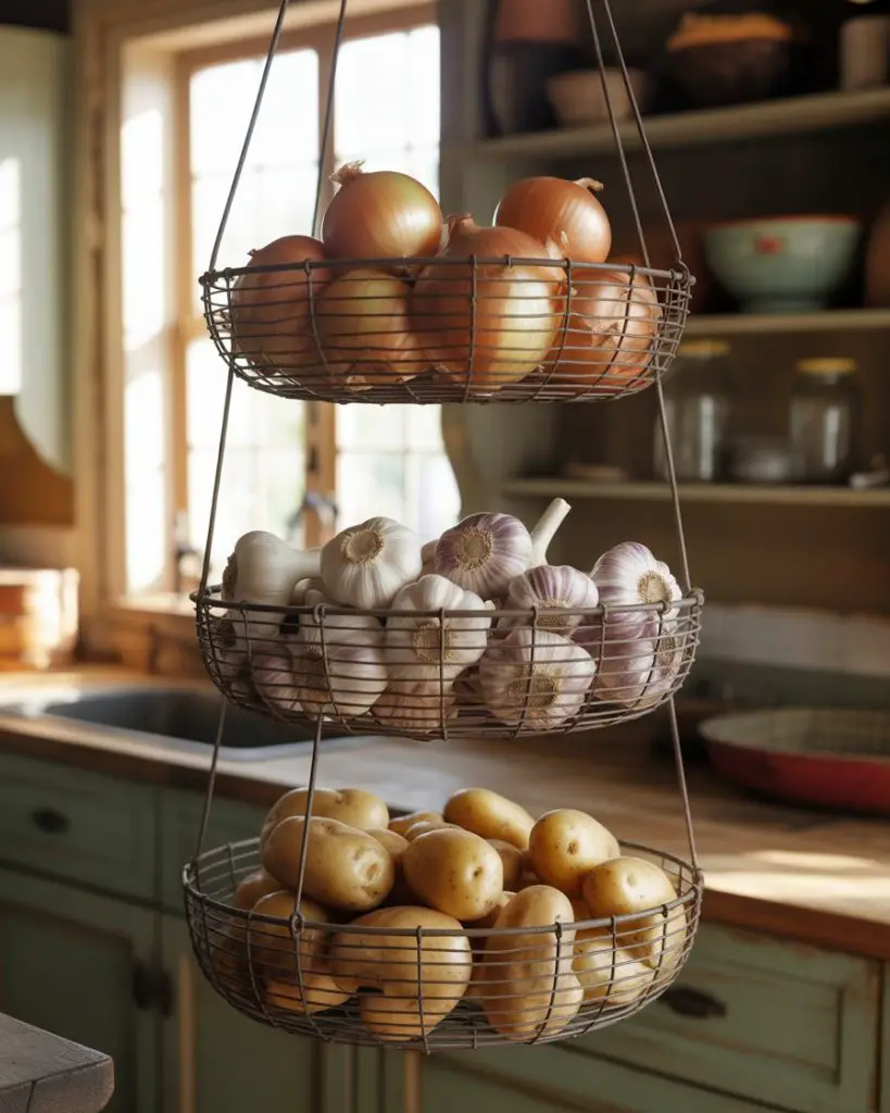 Where it works best: kitchens with high ceilings or empty wall space near the pantry entrance. One common mistake is overloading the baskets, which stresses the hooks and can cause tearing in woven styles. Stick to lighter produce and check the weight limits on your hardware. It’s also smart to place a small tray or mat underneath to catch any stray dirt or peelings.
