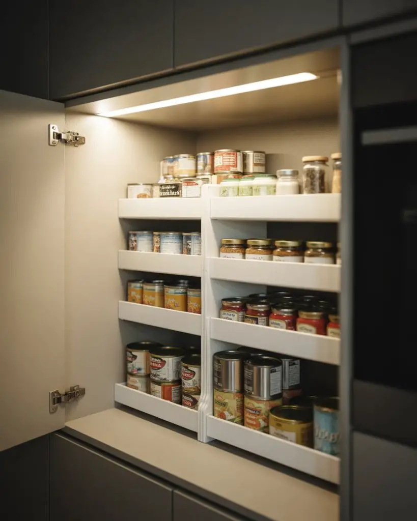 Tiered shelves are a game-changer when you’re working with deep cabinet space that tends to swallow smaller items. These risers lift jars, cans, and spice bottles so everything sits at a different height, giving you a clear view of what’s in stock. They’re particularly useful in small spaces where vertical real estate is your best friend. You’ll find versions in bamboo, acrylic, or coated wire, each offering a slightly different vibe.
