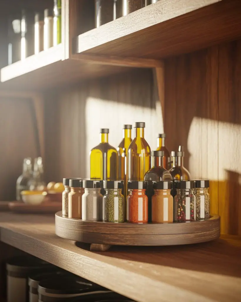 Corner shelves are notoriously awkward, but a lazy Susan solves that problem with a single spin. Load it up with oils, vinegars, sauces, or canned goods, and you’ll never have to reach blindly into the back again. This trick is especially handy in walk in pantries where corner shelving is common, or in small closet conversions where every surface needs to pull its weight. The circular motion feels almost satisfying once you get used to it.
