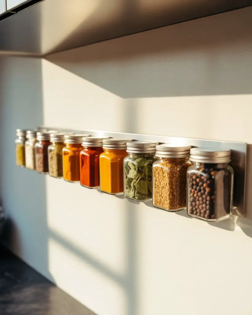 Magnetic spice jars stuck to a metal strip free up shelf space and put your spices at eye level, which is surprisingly handy when you’re mid-recipe. This setup is popular in small kitchens where counter and cabinet real estate is tight, and it adds a modern, almost industrial edge to the aesthetic. The jars are usually uniform in size, creating a clean, organized look that’s also functional.