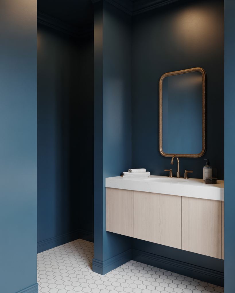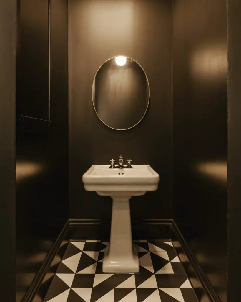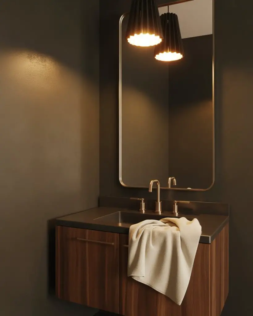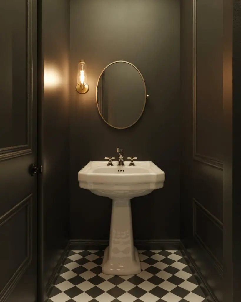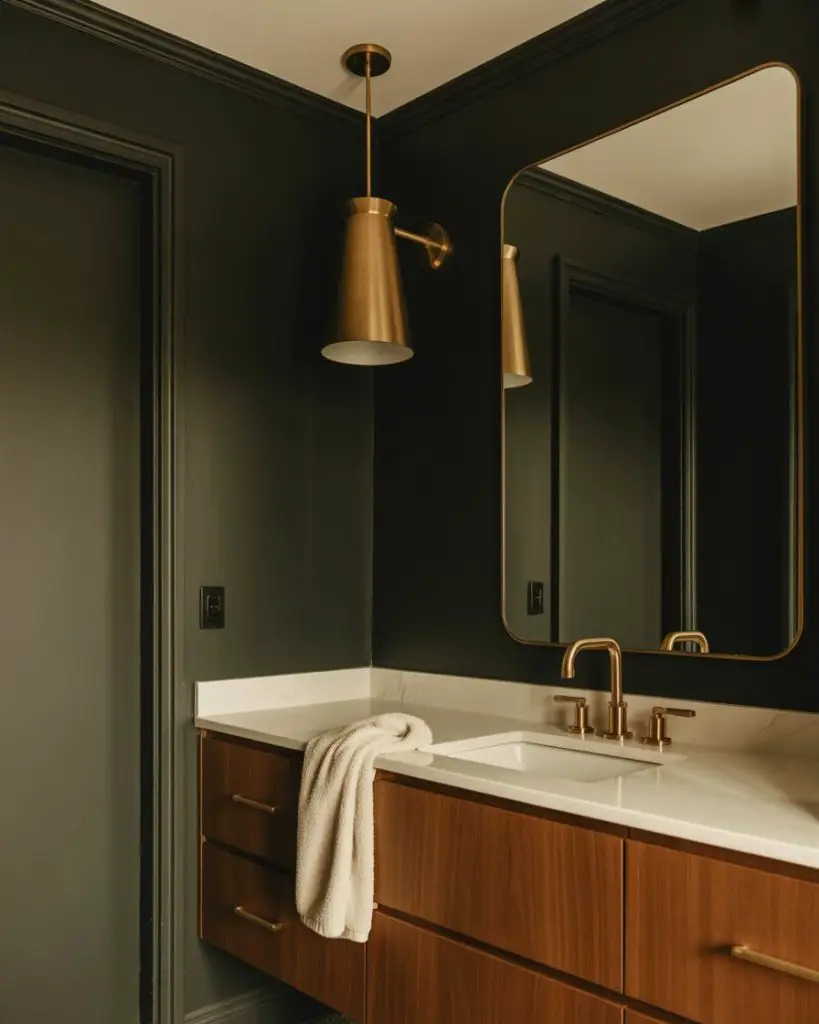 This approach works best in homes with plenty of natural light elsewhere—the drama of a dark powder room becomes a pleasant surprise when you step away from sun-filled living areas. Consider adding a statement mirror with a metallic frame to bounce light around and prevent the space from feeling cave-like. The key is balancing the darkness with reflective surfaces and at least one source of warm, flattering light that makes guests feel good when they catch their reflection.