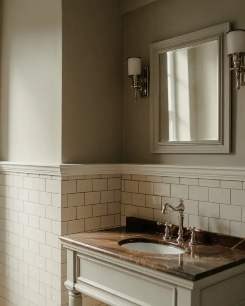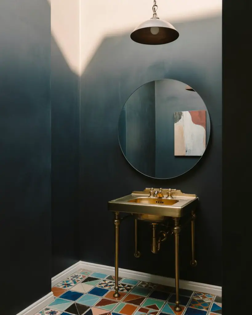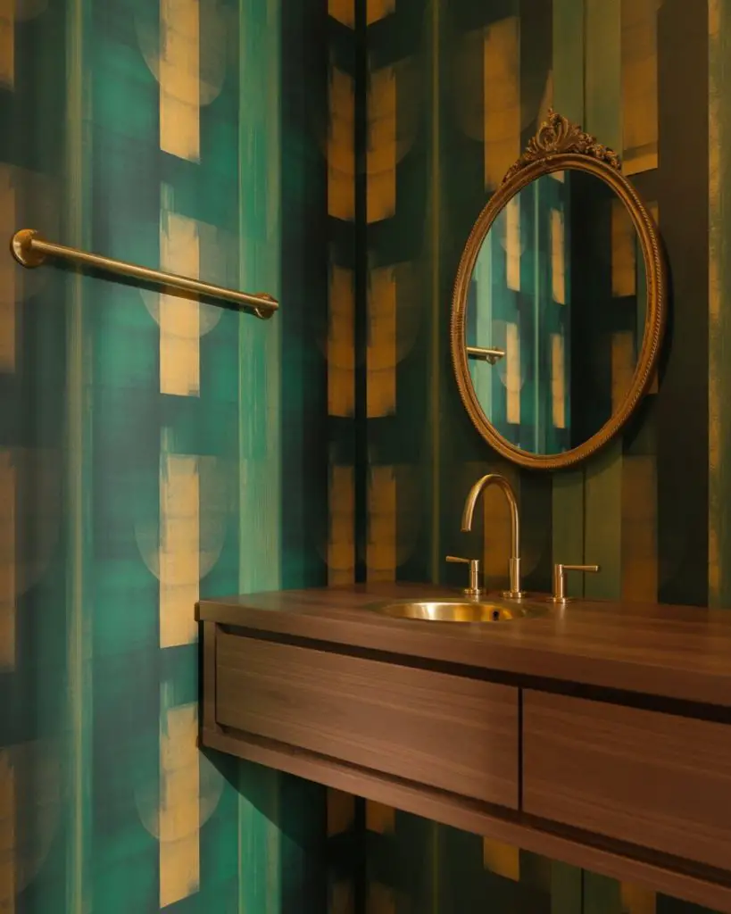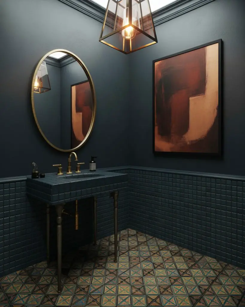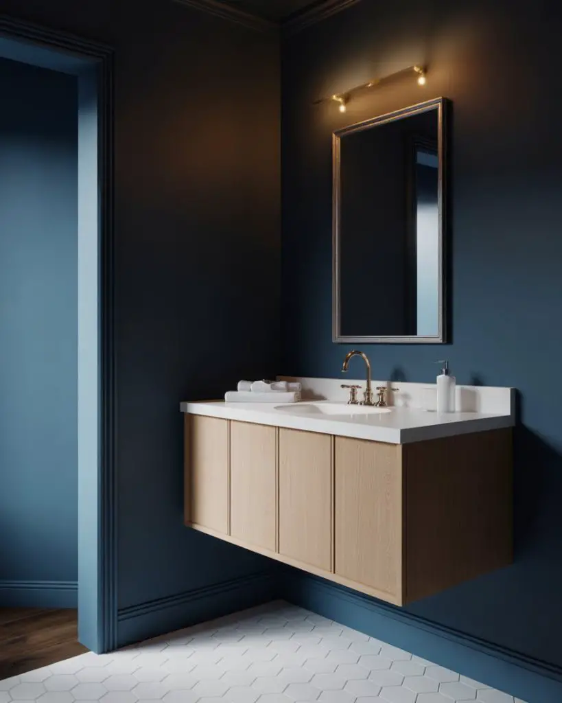 This approach works best in homes with plenty of natural light elsewhere—the drama of a dark powder room becomes a pleasant surprise when you step away from sun-filled living areas. Consider adding a statement mirror with a metallic frame to bounce light around and prevent the space from feeling cave-like. The key is balancing the darkness with reflective surfaces and at least one source of warm, flattering light that makes guests feel good when they catch their reflection.