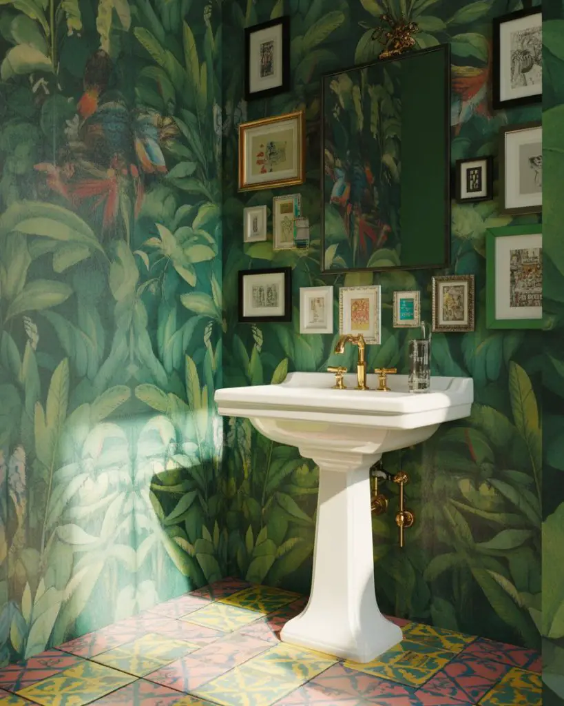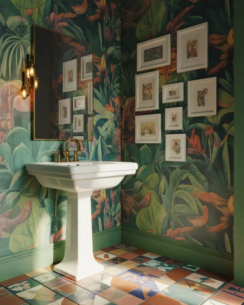 The colorful maximalist powder room is where pattern, color, and personality collide in the best possible way. Wallpaper with bold prints, fun patterned floor tiles, and collections of artwork create a visual feast that’s energizing rather than overwhelming because you’re only in the space for a few minutes at a time. This is your permission slip to go wild with that tropical print, geometric pattern, or vintage-inspired design you’d hesitate to use anywhere else.