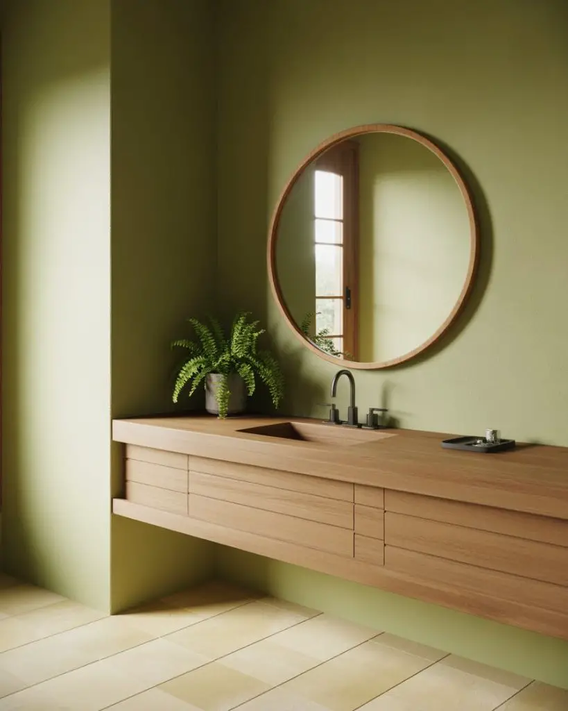 Where this works best is in homes with views of greenery or in urban spaces where occupants crave a nature connection they can’t get outside. A color consultant mentioned that green is uniquely forgiving—it rarely clashes with skin tones in mirror reflections, which matters more than people realize in a space where you’re checking your appearance. Avoid the cheapest paint grades though; green can go muddy or artificially bright with poor pigment quality, so invest in mid-to-high-end paint for the truest, most beautiful color that ages well.