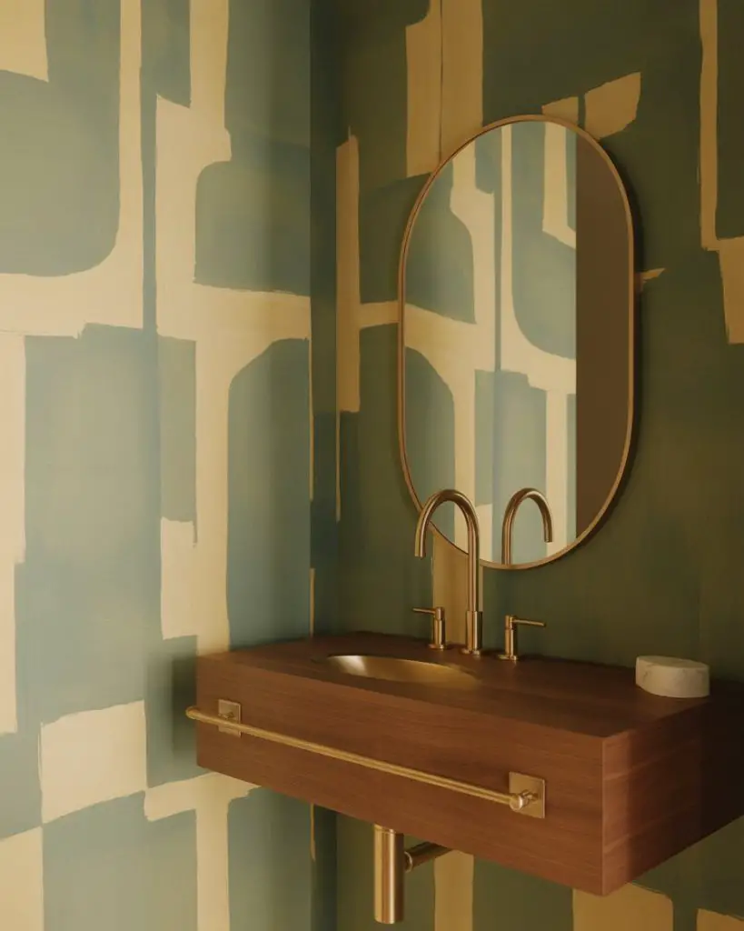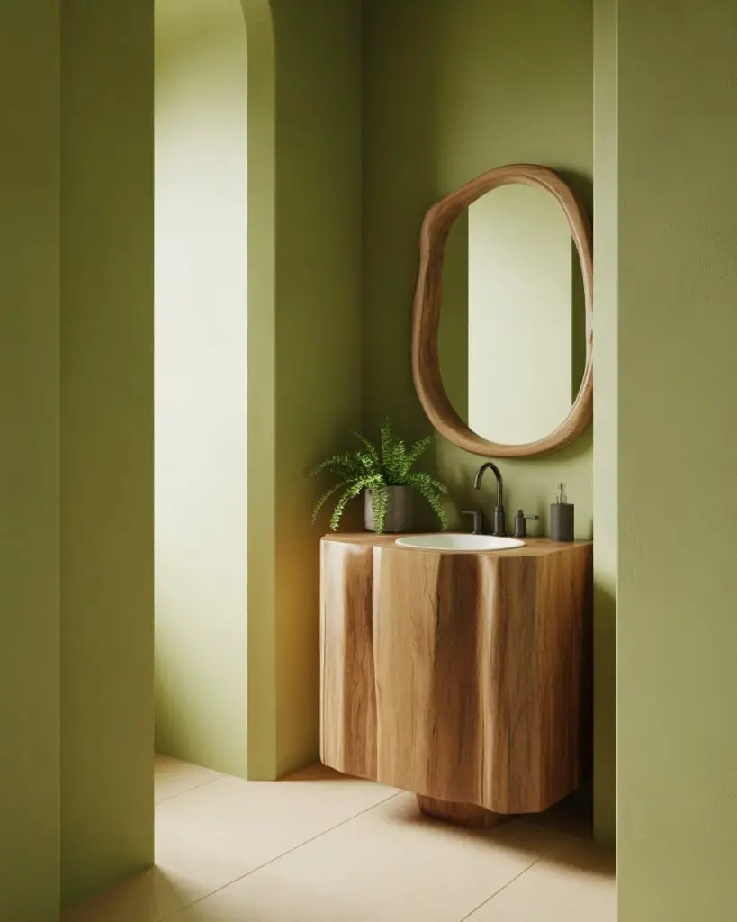 Designers are calling green the new neutral, and powder rooms are proving grounds for this claim. From soft sage to deep forest tones, green creates a connection to nature that feels both grounding and sophisticated. It’s particularly effective in organic modern and earthy schemes where you want color that doesn’t fight with natural materials but enhances them. Green plays beautifully with brass, wood, stone, and even unexpected metallics like copper or black fixtures.