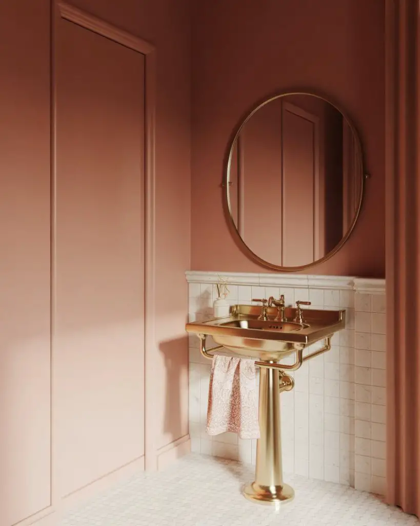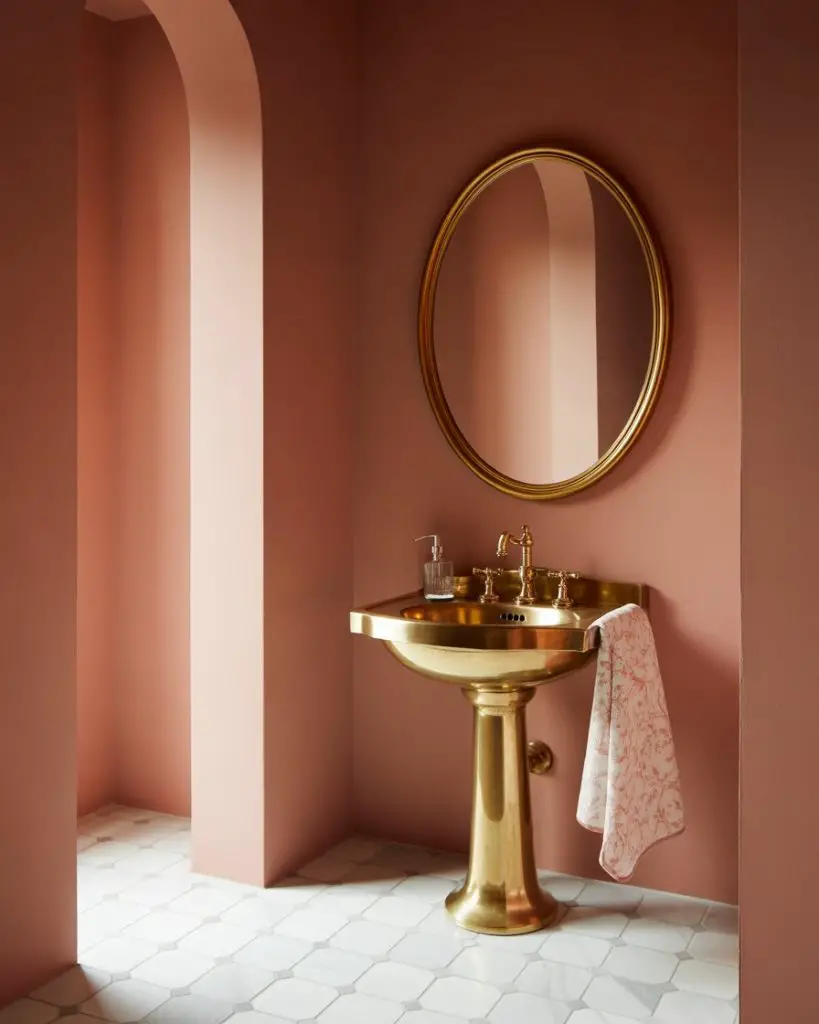 Today’s pink powder rooms have moved far beyond Pepto-Bismol territory into sophisticated territory—think dusty rose, terracotta-tinged blush, or even dramatic deep coral. These evolved pinks work in both modern luxury and classic settings, providing warmth without reading overly feminine or juvenile. Paired with the right materials—marble, brass, dark wood—pink becomes utterly grown-up and seriously chic.