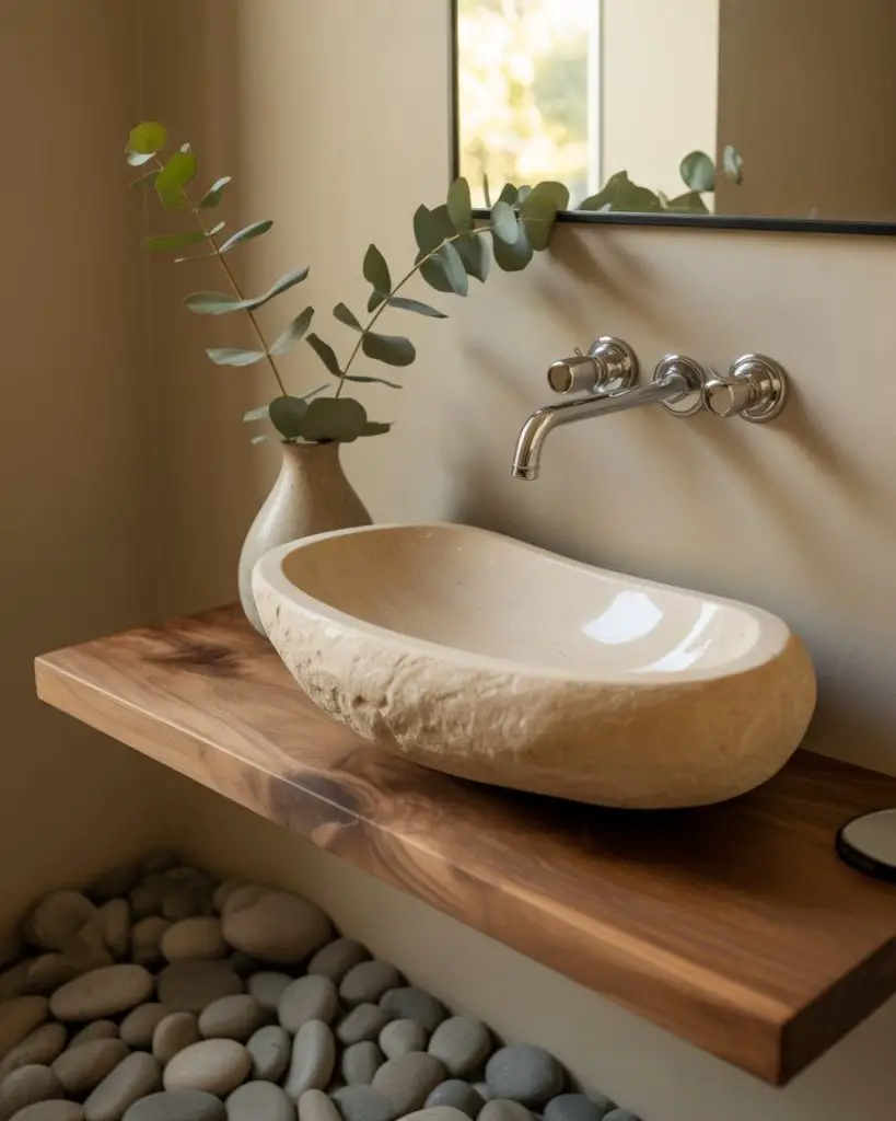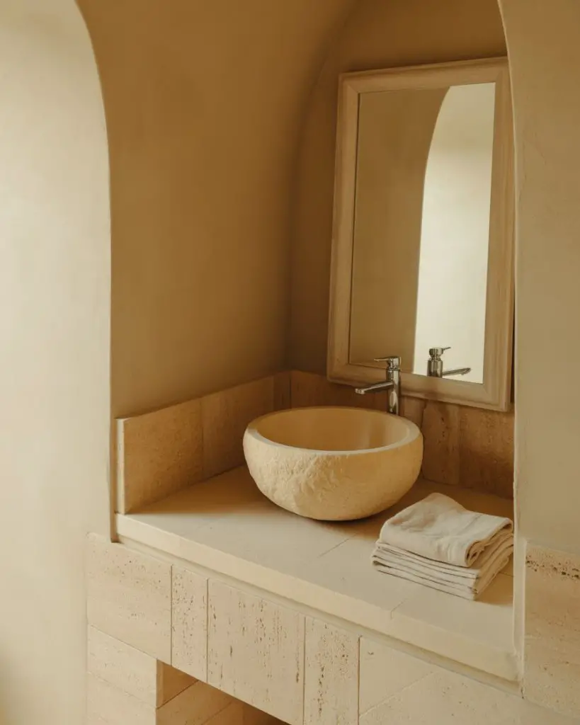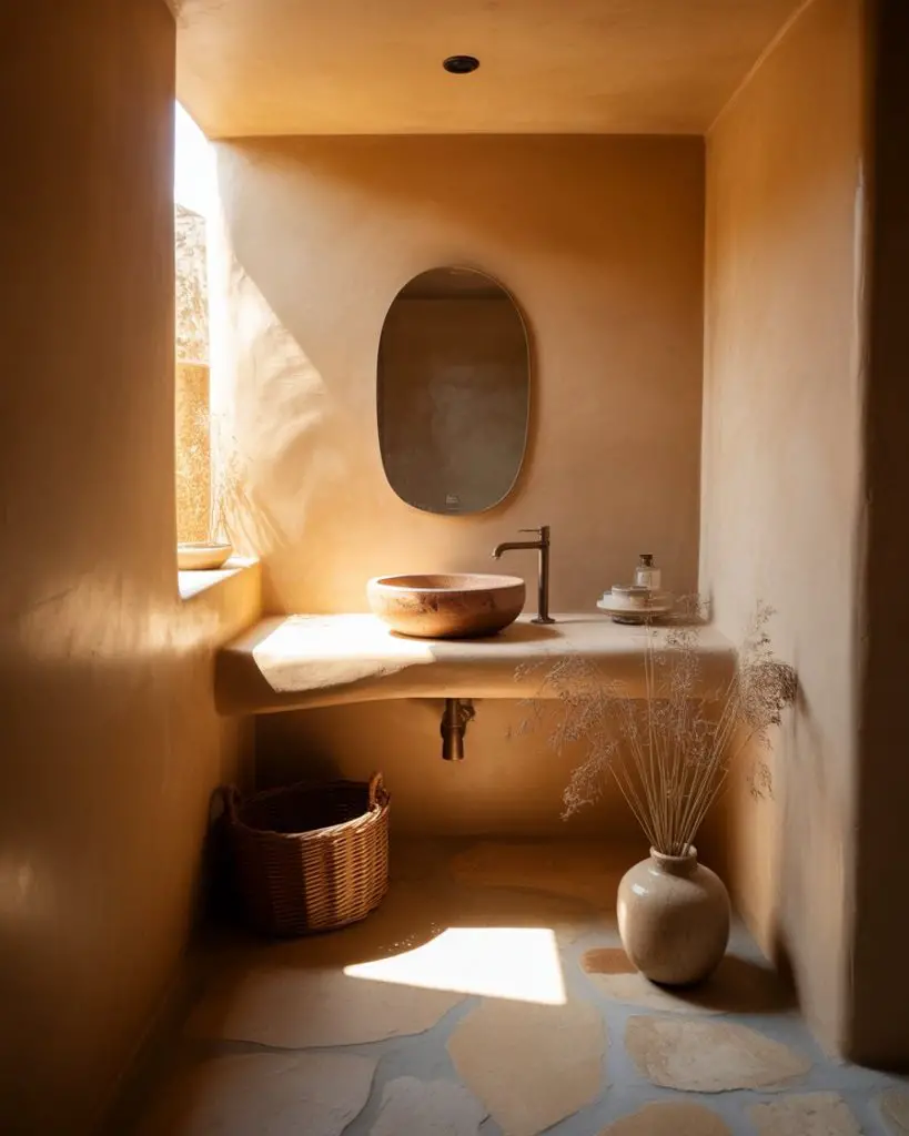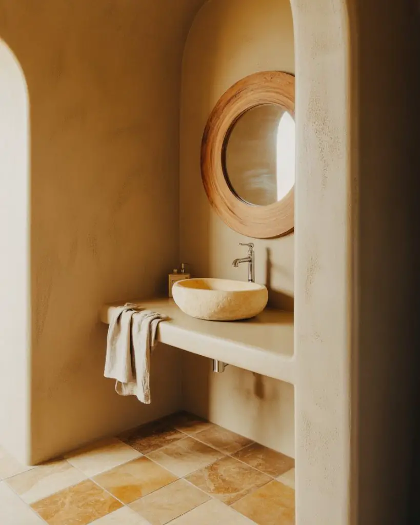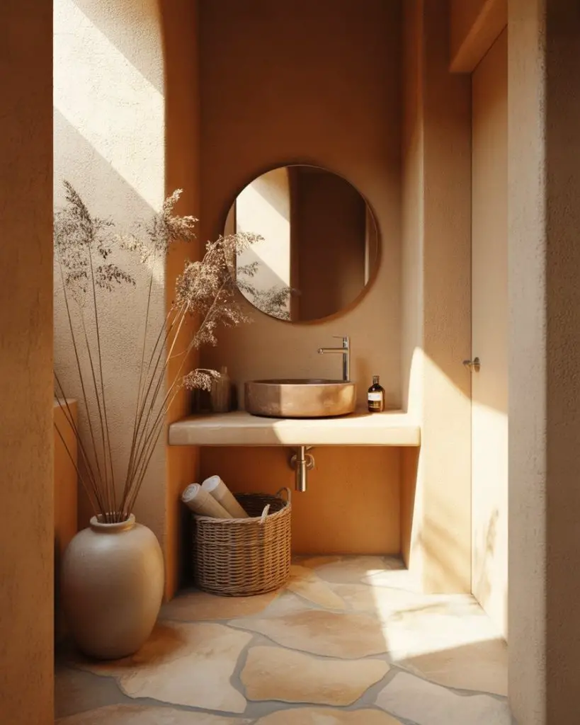The earthy powder room grounds you immediately with materials pulled straight from nature—clay plaster walls, sand-colored limestone, wood with visible grain, and textiles in ochre, rust, and bark brown. This palette feels inherently warm and welcoming, creating a sensory experience that’s both visually and tactilely satisfying. It’s the antithesis of cold minimalism, instead offering a warm minimalism that Americans are increasingly drawn to as a counterbalance to screen-saturated lives.